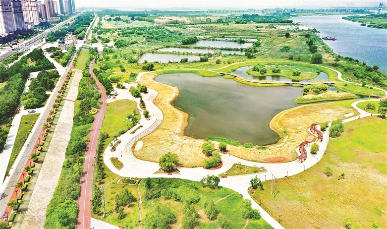 22日,端午節(jié),陽光明媚。哈爾濱市群力外灘濕地公園內,綠樹成蔭,芳草遍地,許多市民前來踏青游玩。