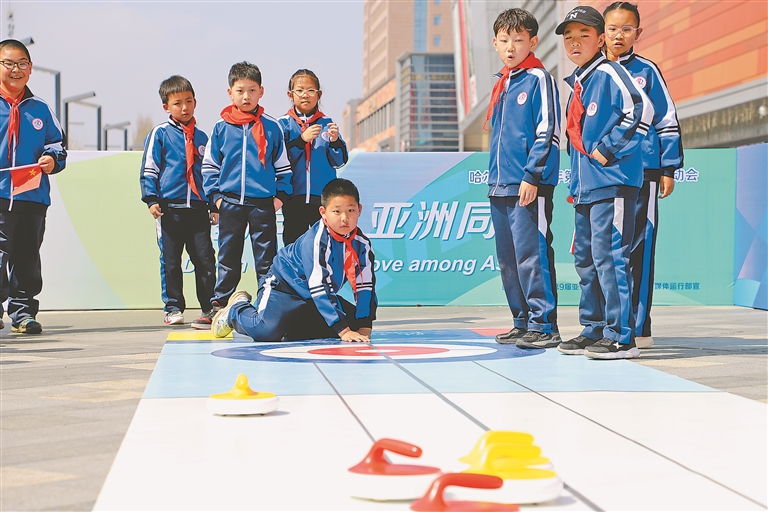 來自哈爾濱新區(qū)的學(xué)生體驗旱地冰壺。