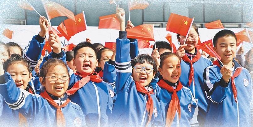 哈爾濱新區(qū)中小學(xué)校的學(xué)生手持國旗,慶祝亞冬會倒計時300天。