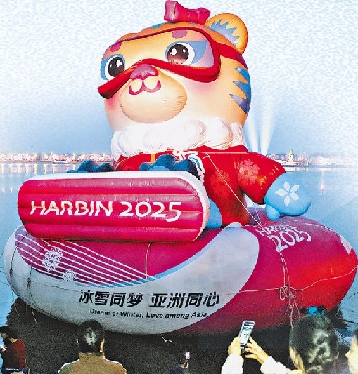 4月13日,巨型亞冬會吉祥物“妮妮”氣模亮相松花江。