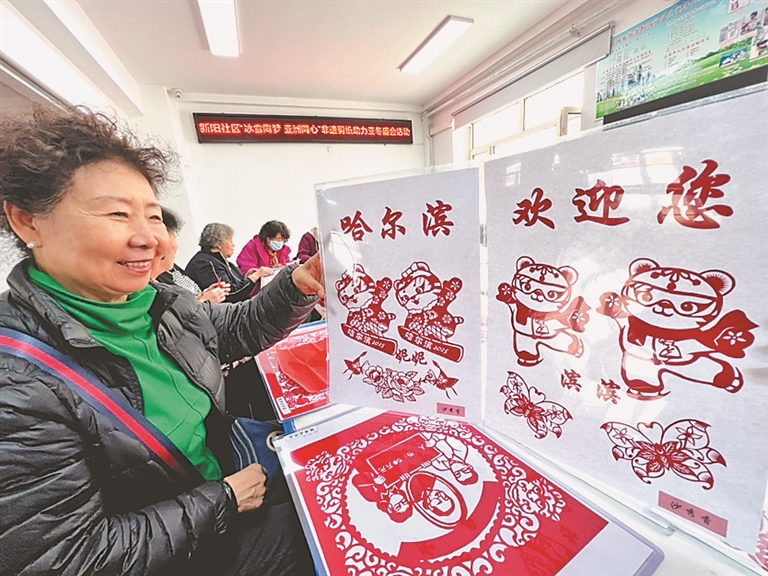 哈爾濱市道里區(qū)新陽社區(qū)居民創(chuàng)作亞冬會主題剪紙作品。