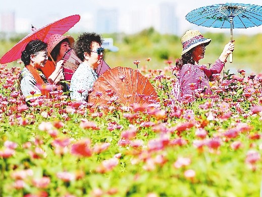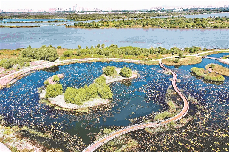 15日,中秋假期第一天,哈爾濱市群力外灘濕地公園,秋季的江畔濕地,風光旖旎、美景如畫,許多游人在觀光游玩,有的走在濕地棧道上觀賞美麗風景,有的在百日菊花海中留下精彩瞬間,有的與孩子一起騎車在林間小道上穿行。