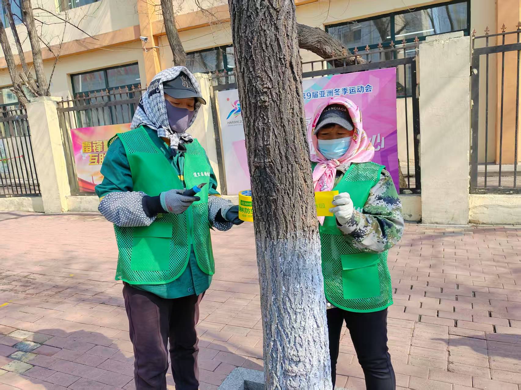 本次防治工作秉持“預(yù)防為主、綜合防治”的原則,充分結(jié)合哈爾濱的氣候特征以及病蟲害發(fā)生規(guī)律,采取一系列針對性舉措。其中藥劑消殺主要對城區(qū)樹木普遍噴施石硫合劑,可以有效殺滅越冬蟲卵與病原菌,降低病蟲害滋生基數(shù)。各區(qū)園林部門針對長勢欠佳,以及易感染楊柳爛皮病、潰瘍病的樹木進(jìn)行涂白處理,增強(qiáng)樹木抗病能力;針對榆紫葉甲等早春害蟲,在榆樹樹干纏繞黃色粘蟲膠帶,有效阻斷害蟲上樹路徑。