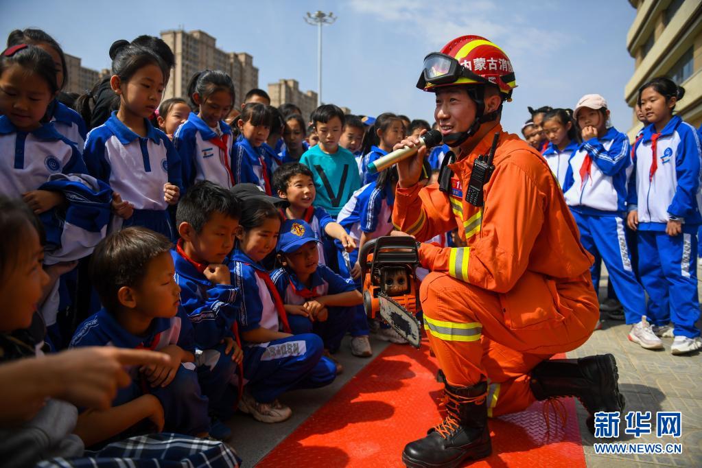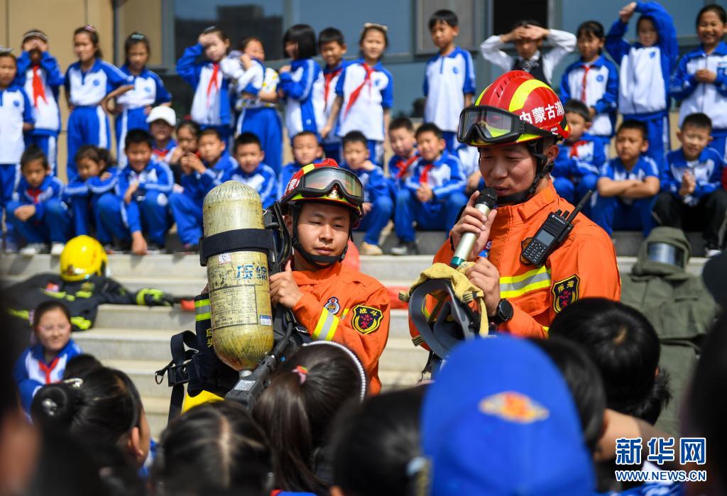 5月12日,呼和浩特市賽罕區(qū)消防救援大隊的指戰(zhàn)員為內(nèi)蒙古師范大學(xué)第二附屬學(xué)校小學(xué)部的學(xué)生講解消防裝備的使用方法。新華社記者 彭源 攝