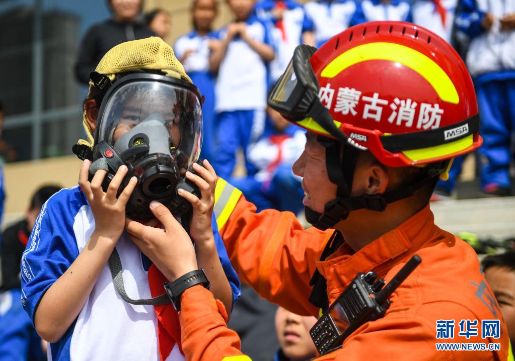 5月12日,內(nèi)蒙古師范大學(xué)第二附屬學(xué)校小學(xué)部的學(xué)生在呼和浩特市賽罕區(qū)消防救援大隊指戰(zhàn)員的指導(dǎo)下體驗空氣呼吸器。新華社記者 彭源 攝