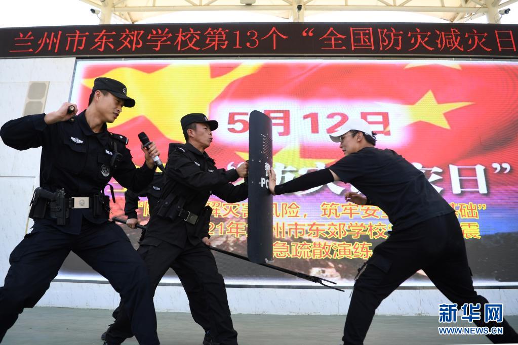 5月12日,在蘭州市東郊學(xué)校,蘭州市公安局城關(guān)分局民警在防災(zāi)減災(zāi)安全教育活動上進行校園應(yīng)急處突演練。新華社記者 陳斌 攝