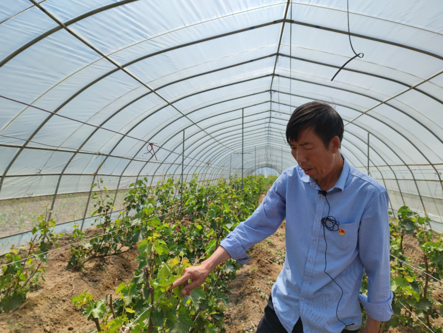 農(nóng)戶在大棚內(nèi)查看葡萄長勢