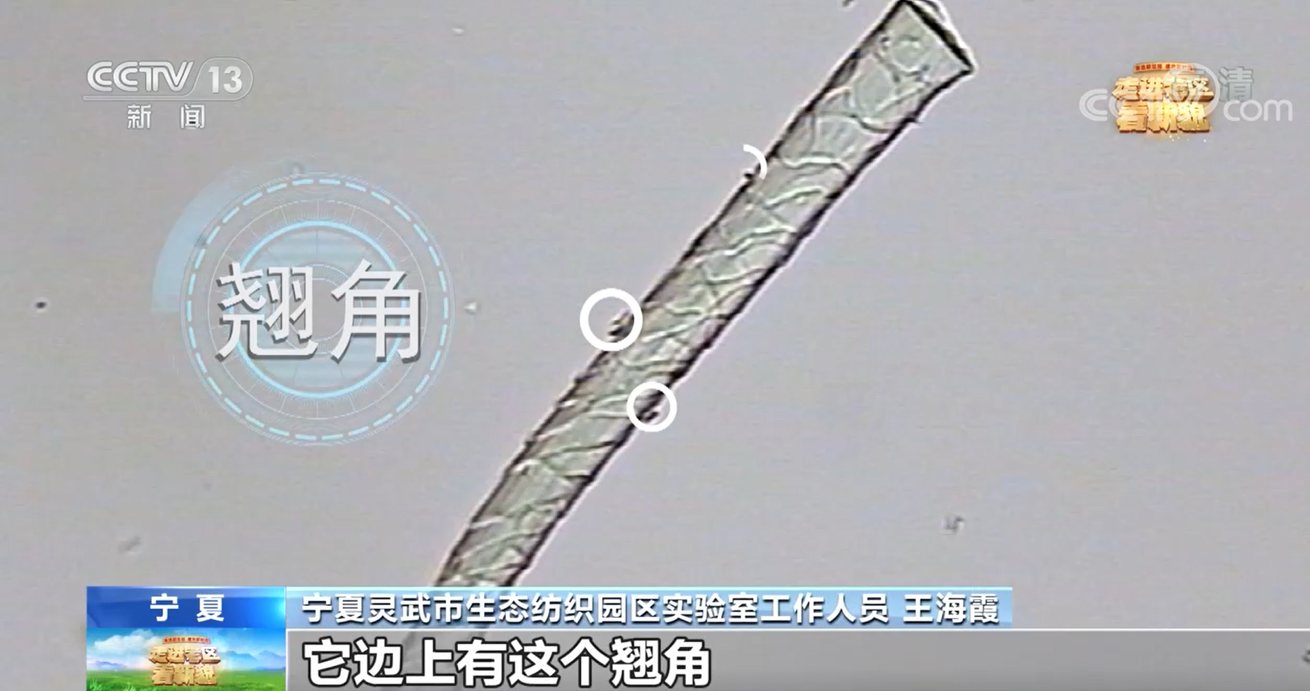 寧夏靈武市生態(tài)紡織園區(qū)實(shí)驗室工作人員 王海霞:羊毛纖維大家看到了,它邊上有這個翹角,貼身穿的話會有刺癢感。那我們現(xiàn)在有一個技術(shù),就是把我們羊毛那個翹出來的角剝掉一點(diǎn)點(diǎn)。(一點(diǎn)點(diǎn)有多少?)0.2個微米,約等于我們頭發(fā)(直徑)的三百分之一。