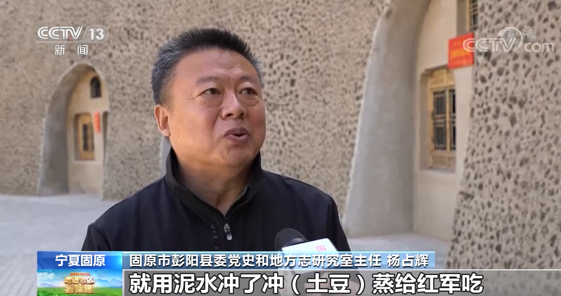 固原市彭陽縣委黨史和地方志研究室主任 楊占輝:因為缺水,就用泥水沖了沖(土豆)蒸給紅軍吃。(紅軍)一邊吃著帶泥的土豆,一邊說“今天我們吃帶泥的土豆,是為了明天老百姓不吃帶泥的土豆”。