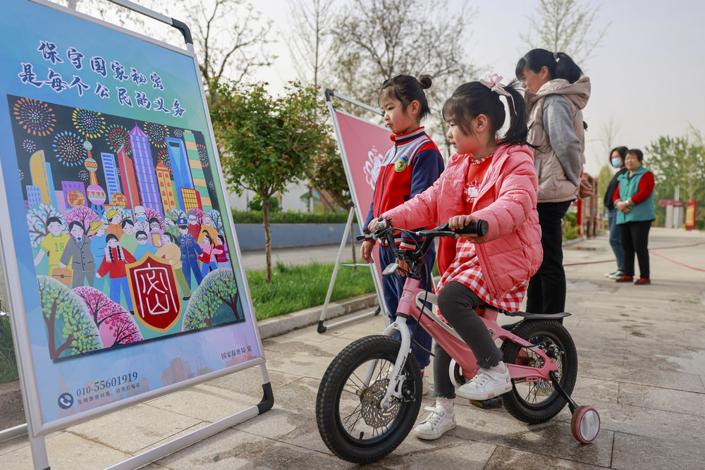 4月15日,在河北省唐山市豐南區(qū)岔河鎮(zhèn)小稻地村,小朋友和家長在觀看國家安全教育日主題展覽。新華社發(fā)(李秀清攝)
