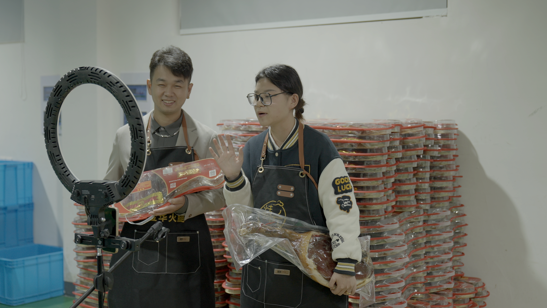 滕維洪的女兒滕楚雯與女婿樓汪聰正在直播銷售自家工廠生產(chǎn)的火腿。
