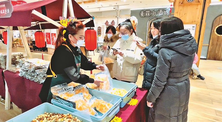 年貨攤前顧客絡(luò)繹不絕。本報見習(xí)記者 李雪君攝