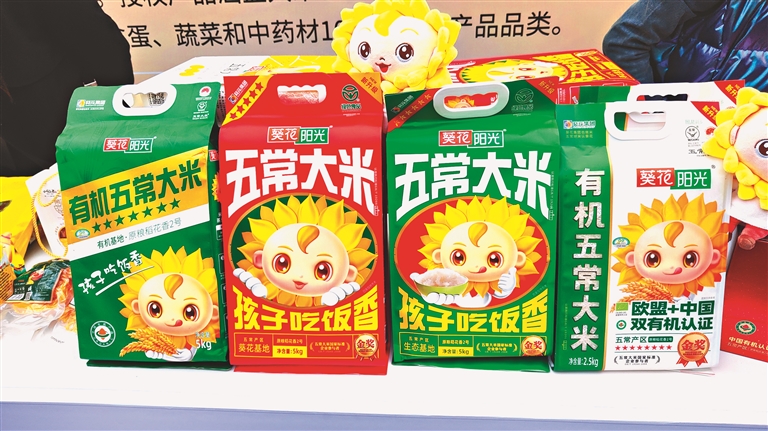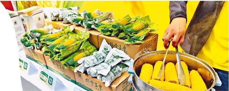 活動(dòng)現(xiàn)場(chǎng)亮相的鮮食玉米、五常大米、蒲公英茶。 見習(xí)記者 唐海兵攝