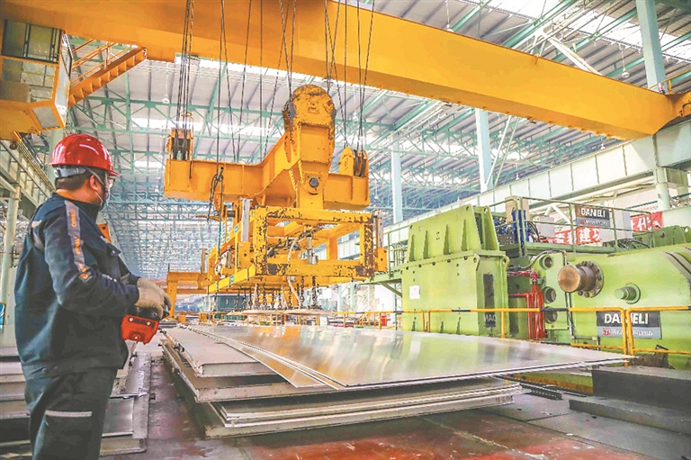 工人正在將鋁合金預拉伸板吊運至料場進行冷卻。