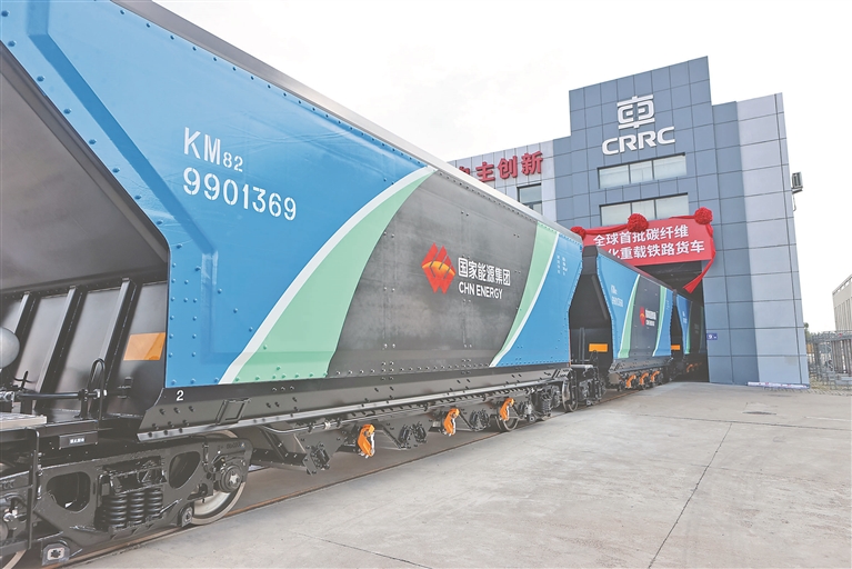 中車齊車打造的全球首批碳纖維復(fù)合材料輕量化重載鐵路貨車。