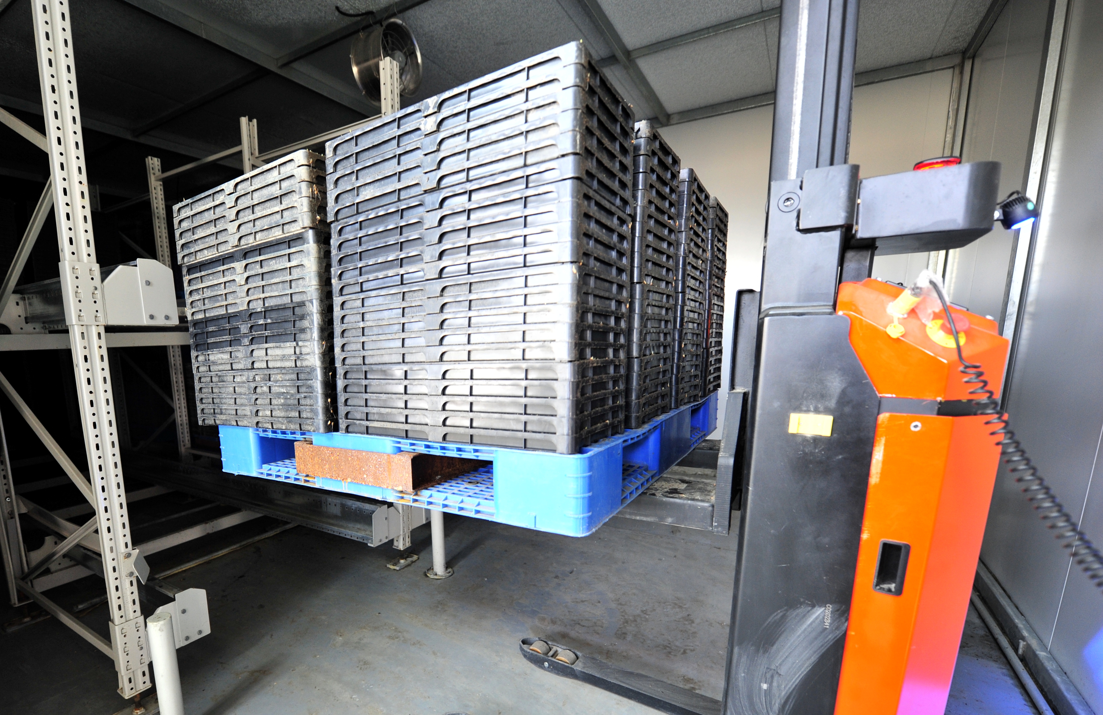 再通過無人AGV叉車與暗室巷道內(nèi)穿梭車聯(lián)動作業(yè),經(jīng)過機動叉車運往室外超級大棚擺盤,進(jìn)行持續(xù)育苗。