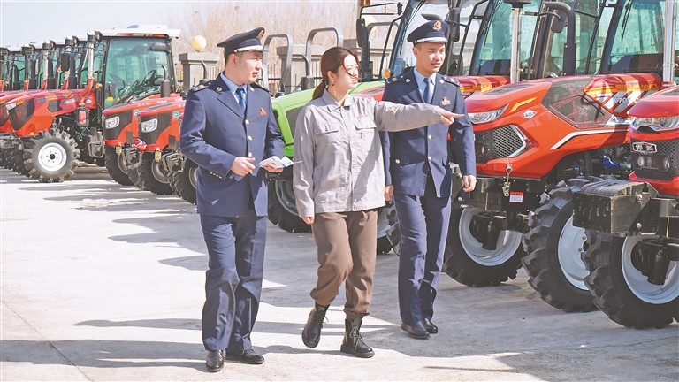 訥河市稅務局工作人員在洪江農(nóng)機銷售有限公司宣傳稅收政策。