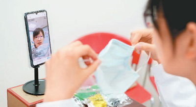 在上海市黃浦區(qū)打浦橋街道社區(qū)衛(wèi)生服務中心,家庭醫(yī)生在直播中與居民就戴口罩的問題進行互動。新華社記者 劉 穎攝