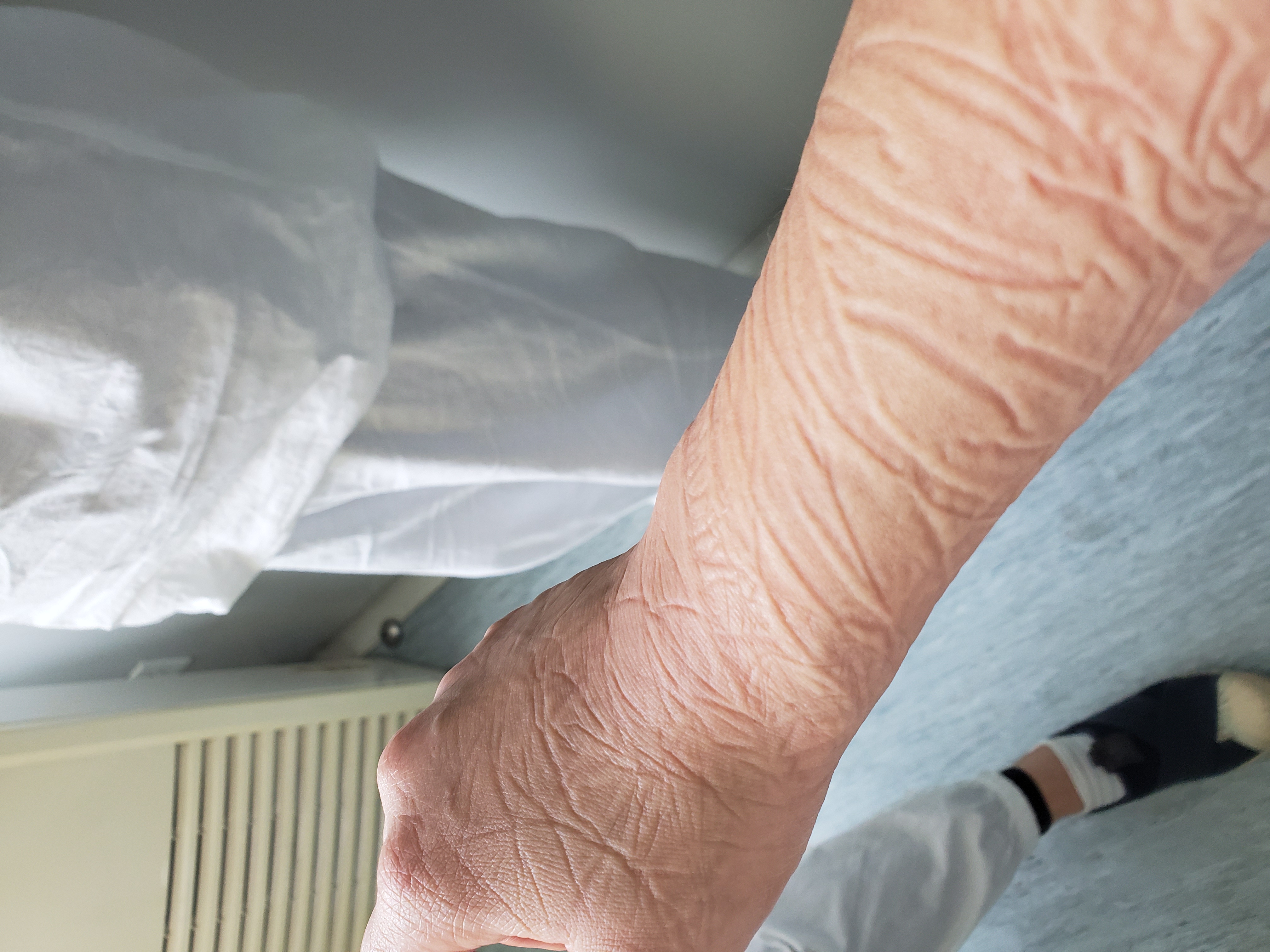 脫下防護服,檢測員的胳膊上布滿溝壑