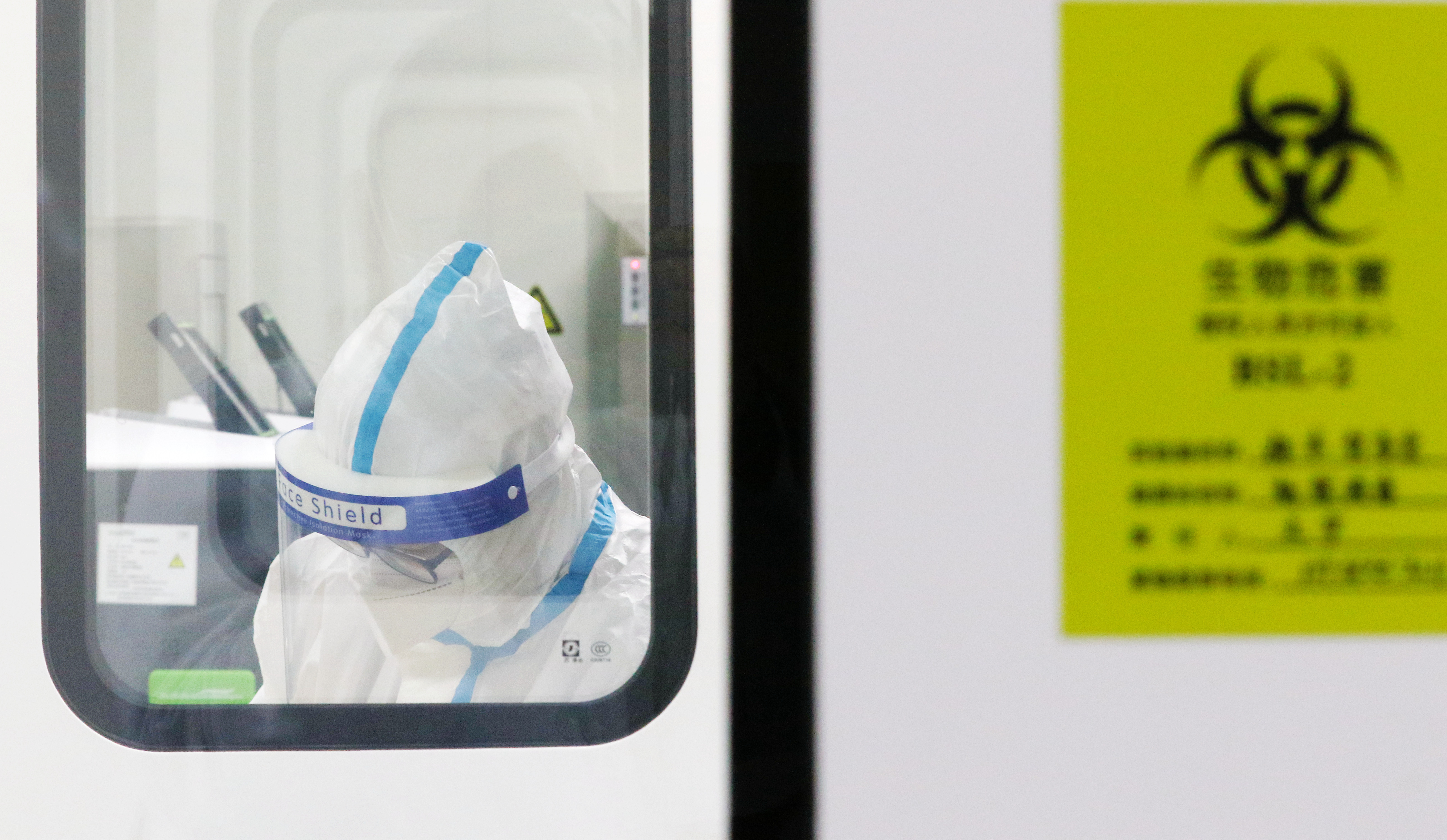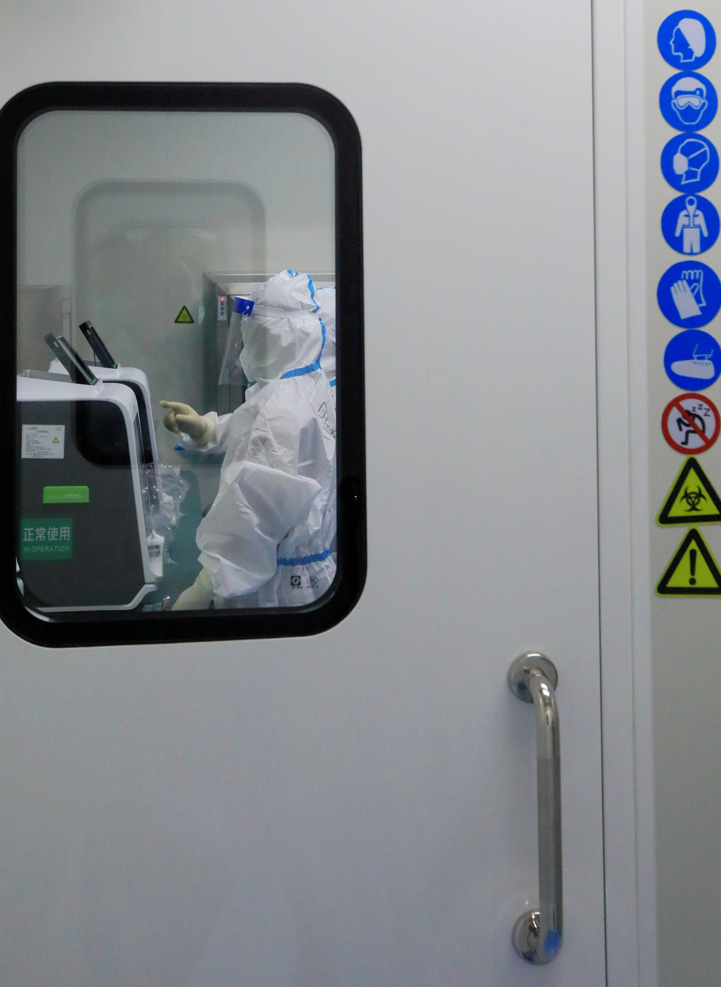 采訪中記者發(fā)現(xiàn),實驗室完全在密閉的環(huán)境中,且走廊內(nèi)、實驗室內(nèi)均有監(jiān)控環(huán)境值的儀表。“操作中,氣體外泄造成污染十分危險,所以,實驗室一直處于負(fù)壓狀態(tài),保證空氣單向流通?!睉亚褰芾^續(xù)說道,在此“硬核”保護下,加之每次進入實驗室都要著三層防護服、戴雙層手套,我們檢測組每個人的面部、胳膊上都有被層層包裹后出現(xiàn)的勒痕,經(jīng)常是手上的濕疹剛下去就又要“上崗”了,但相比能稍微休整一下、回家看看孩子和父母,這些又不覺得怎樣,“沒什么,習(xí)慣了?!比绱艘环萜D辛的工作被懷清杰輕描淡寫地描述著。