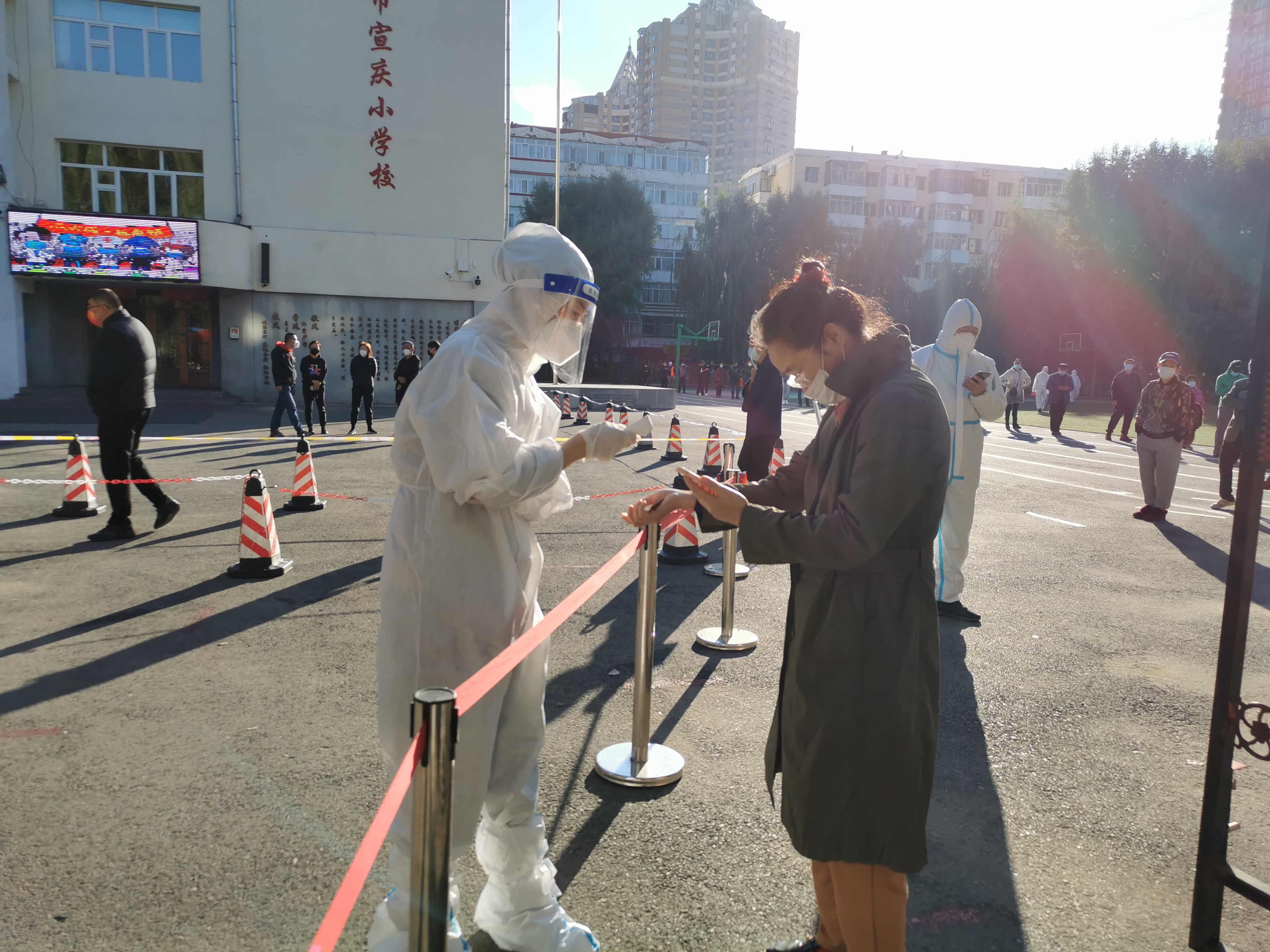 王莉下沉道里區(qū)兆麟社區(qū),配合社區(qū)核酸檢測、協(xié)助掃碼登記、進行現(xiàn)場消殺,發(fā)放“核酸檢測”卡片,一絲不茍。