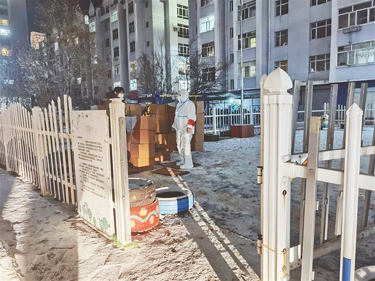 11月7日,在安發(fā)家園小區(qū),熱電廠值守卡口的黨員在雪夜中為居民發(fā)放物資?!耙獙⑦@些關(guān)愛第一時間發(fā)到居民手中。”黨員姜行行表示。