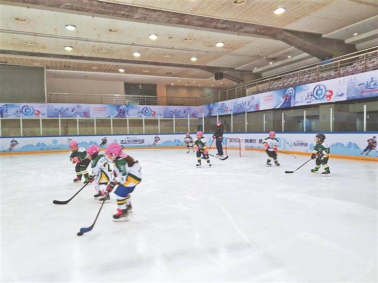 南京市南師附中新城小學(xué)南校區(qū)學(xué)生在市奧體中心冰上俱樂部上冰球課。 圖片由新華日報(bào)提供