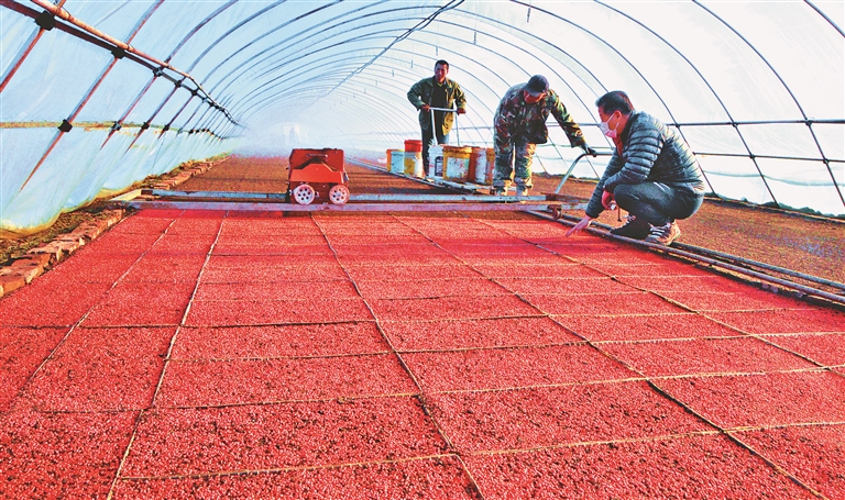種植戶在水稻育秧大棚里進行高標準播種作業(yè)。