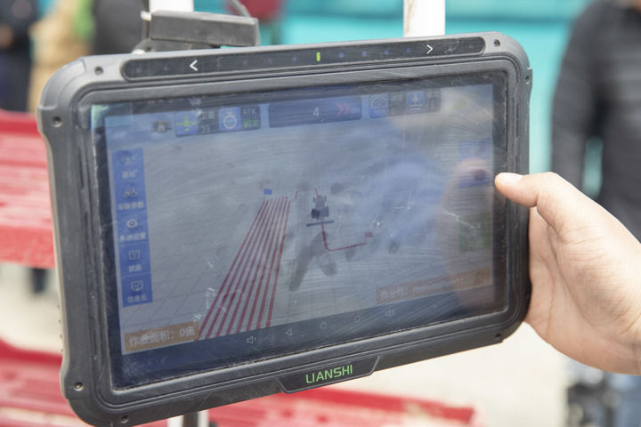 2021年5月11日,在北大荒集團(tuán)紅衛(wèi)農(nóng)場(chǎng)有限公司,工作人員設(shè)置無人駕駛插秧機(jī)工作路徑。新華社記者 張濤 攝