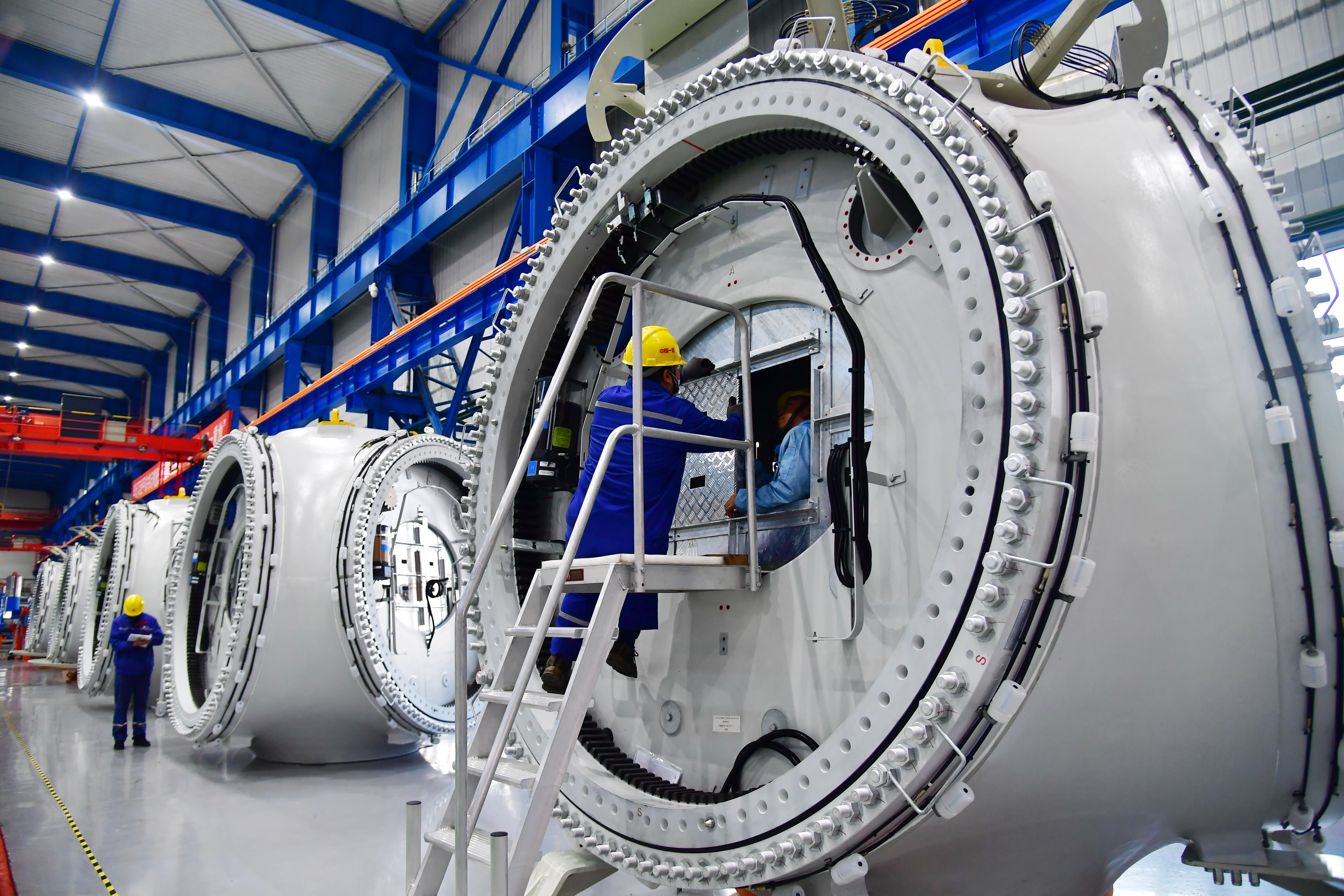 一重集團(tuán)的風(fēng)電制造廠內(nèi),工人正在裝備風(fēng)力發(fā)電機