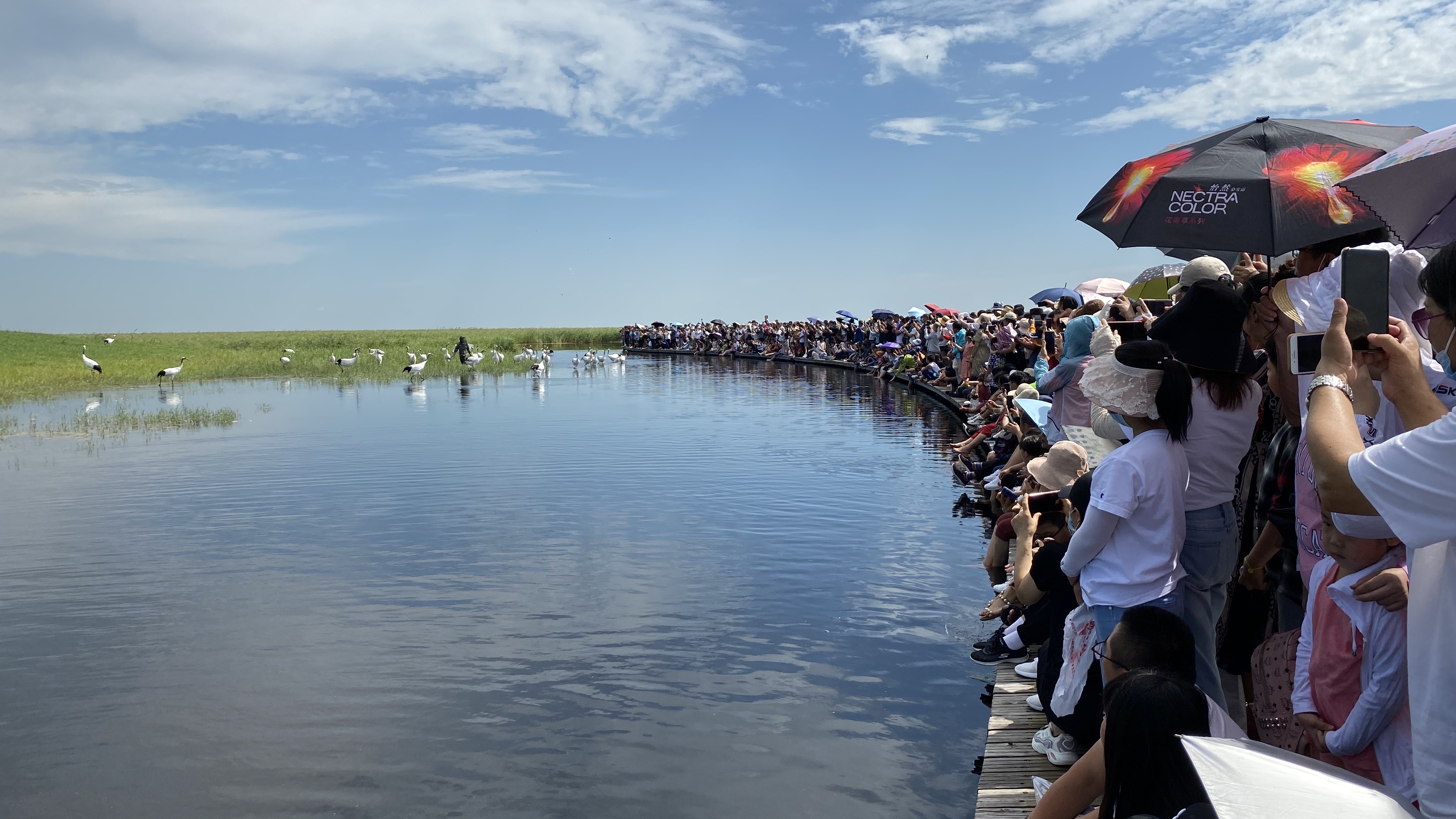 陣陣微風(fēng)吹過,蘆葦慢慢彎了腰,驚動了上面攀落的蜻蜓。放眼望去,幾只丹頂鶴也正騰風(fēng)而起,輕盈優(yōu)美的身影劃破天際,其間還有幾只灰色的白枕鶴也扇動翅膀,游客們不禁加快了步伐,三三兩兩集聚到觀鶴臺。