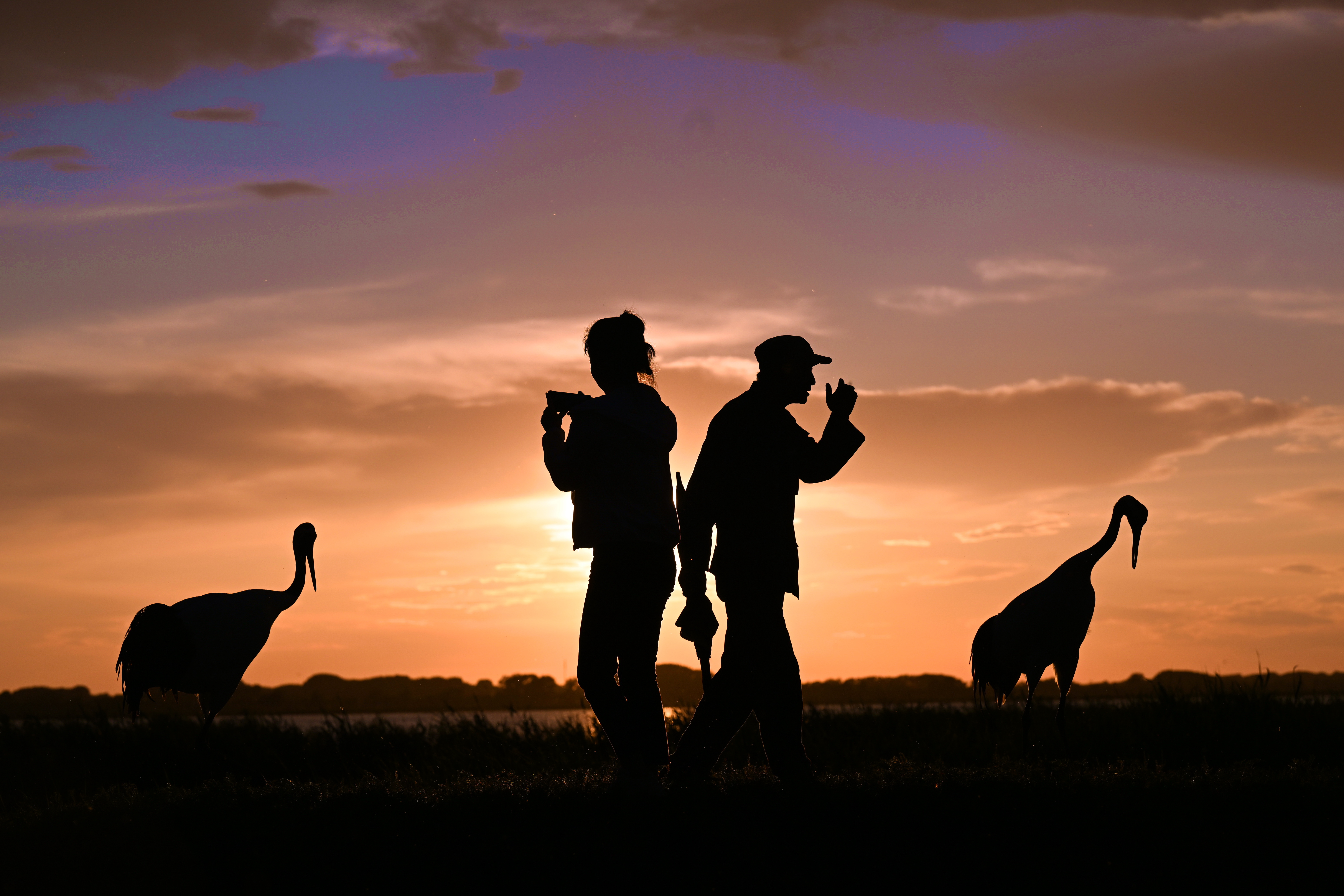 傍晚,徐惠(右)巡訪保護區(qū)內(nèi)的野生丹頂鶴