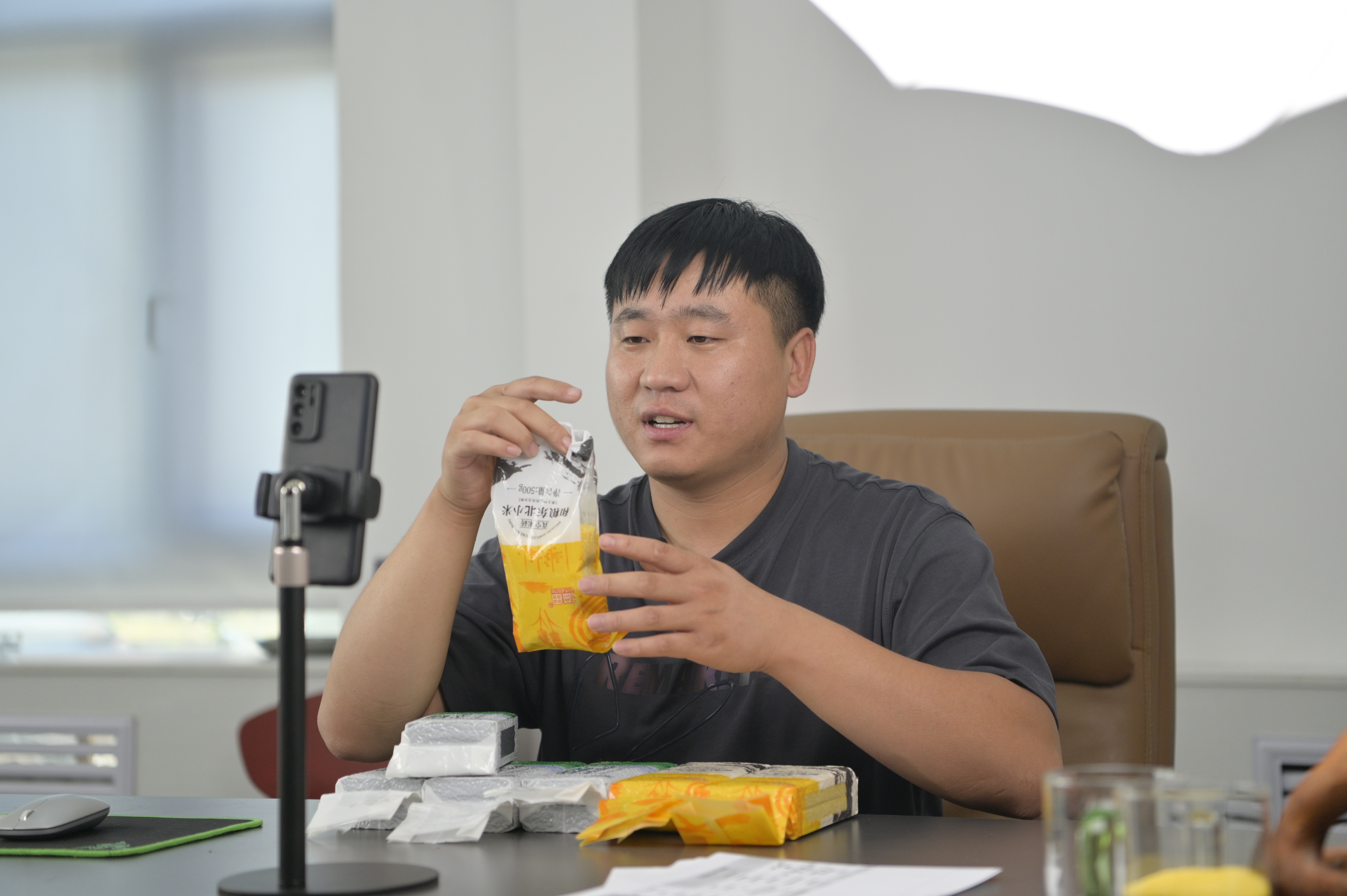 在饒河縣直播電商孵化基地,盧戰(zhàn)開忙著在流水線上幫忙打包蜂蜜,為直播帶貨選擇產(chǎn)品。在政府部門支持下,盧戰(zhàn)開將工作室從村里搬到了縣里,入駐了電商基地。