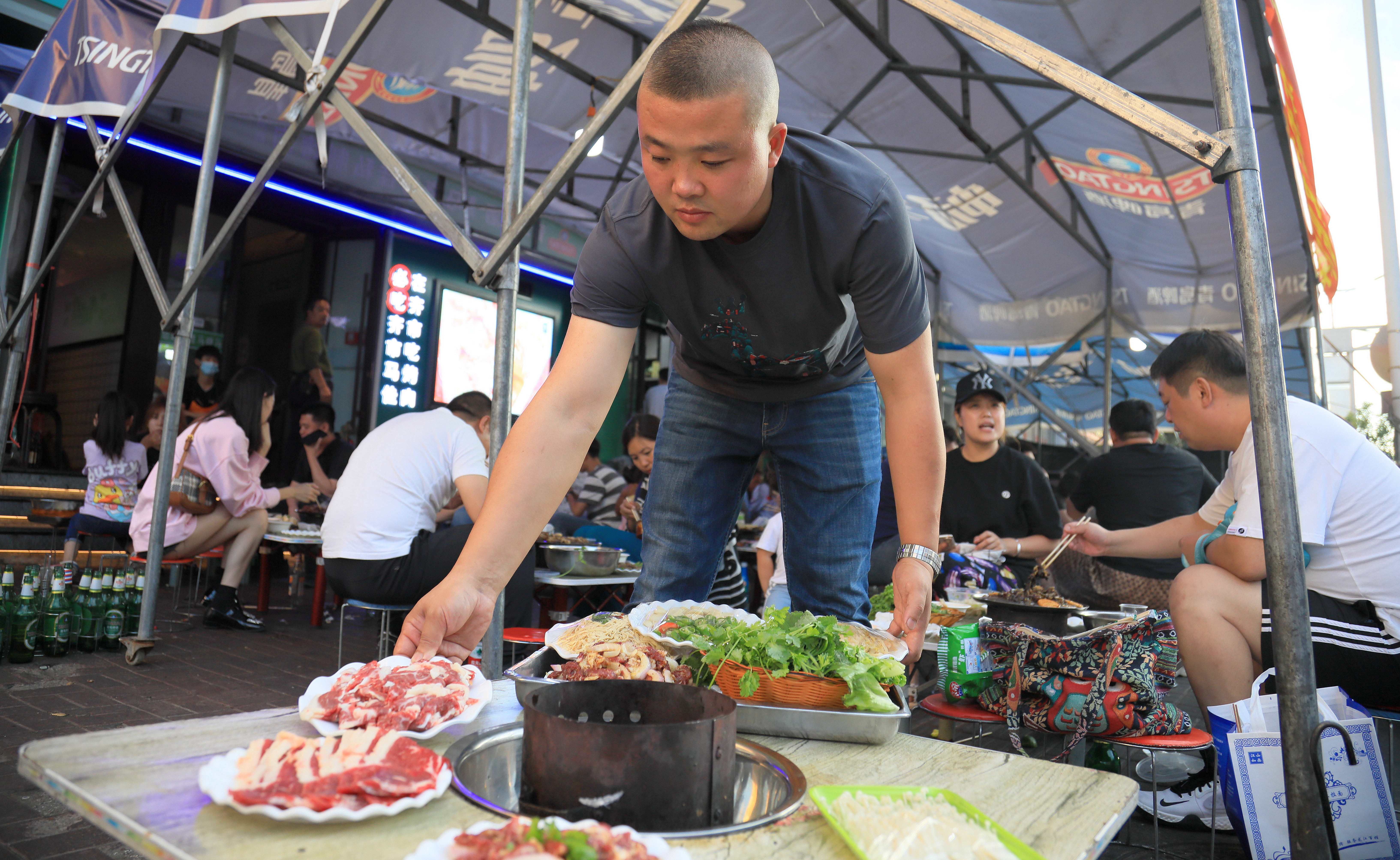 “大家排好隊選肉,找到桌子,等著上炭”。經(jīng)理于海波一邊為顧客切肉一邊吆喝著。今年,齊齊哈爾市被授予“國際烤肉美食之都”稱號,完善的高鐵網(wǎng)絡,讓游客慕名而來,于海波也擴大了店鋪的銷售。