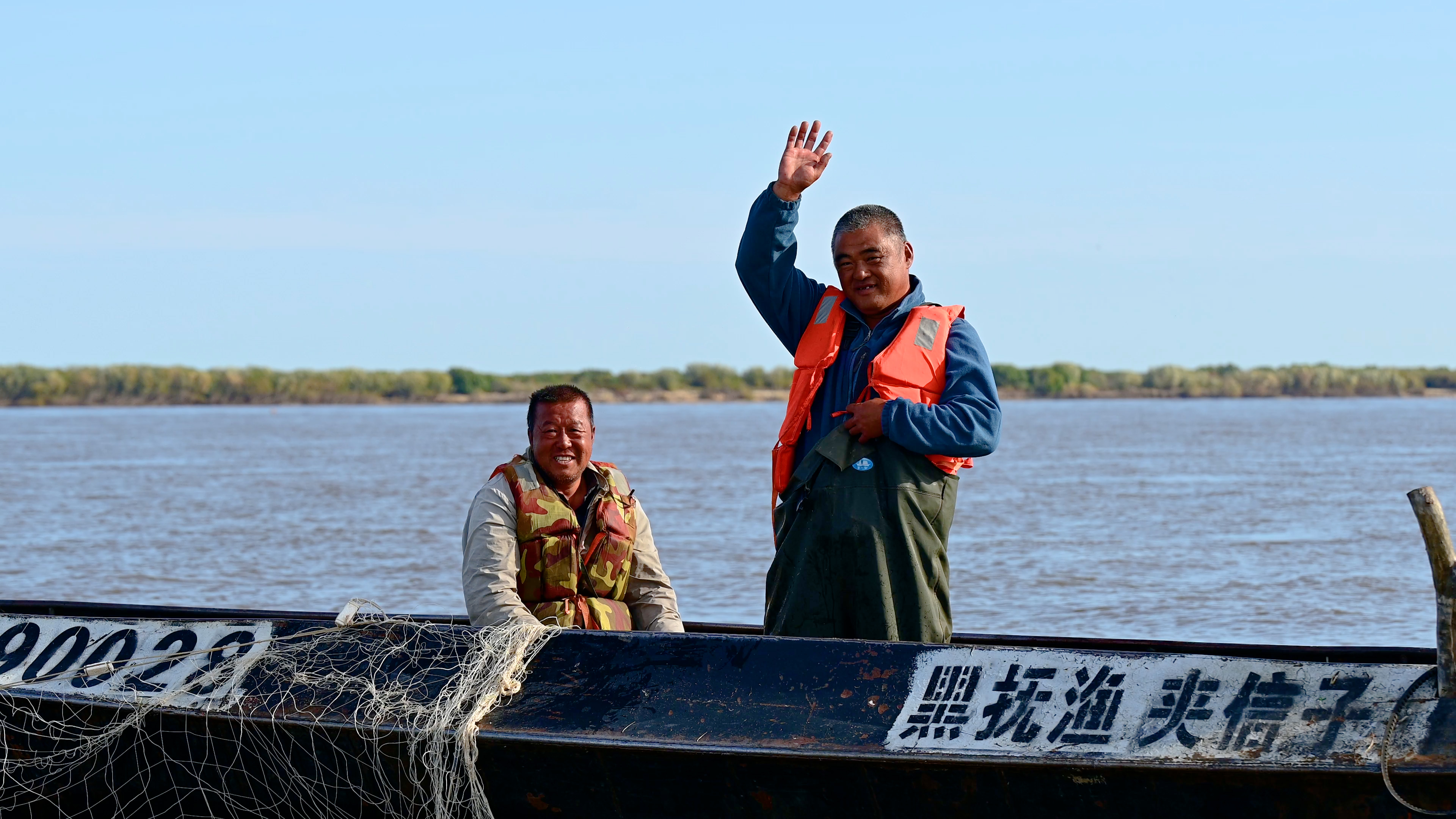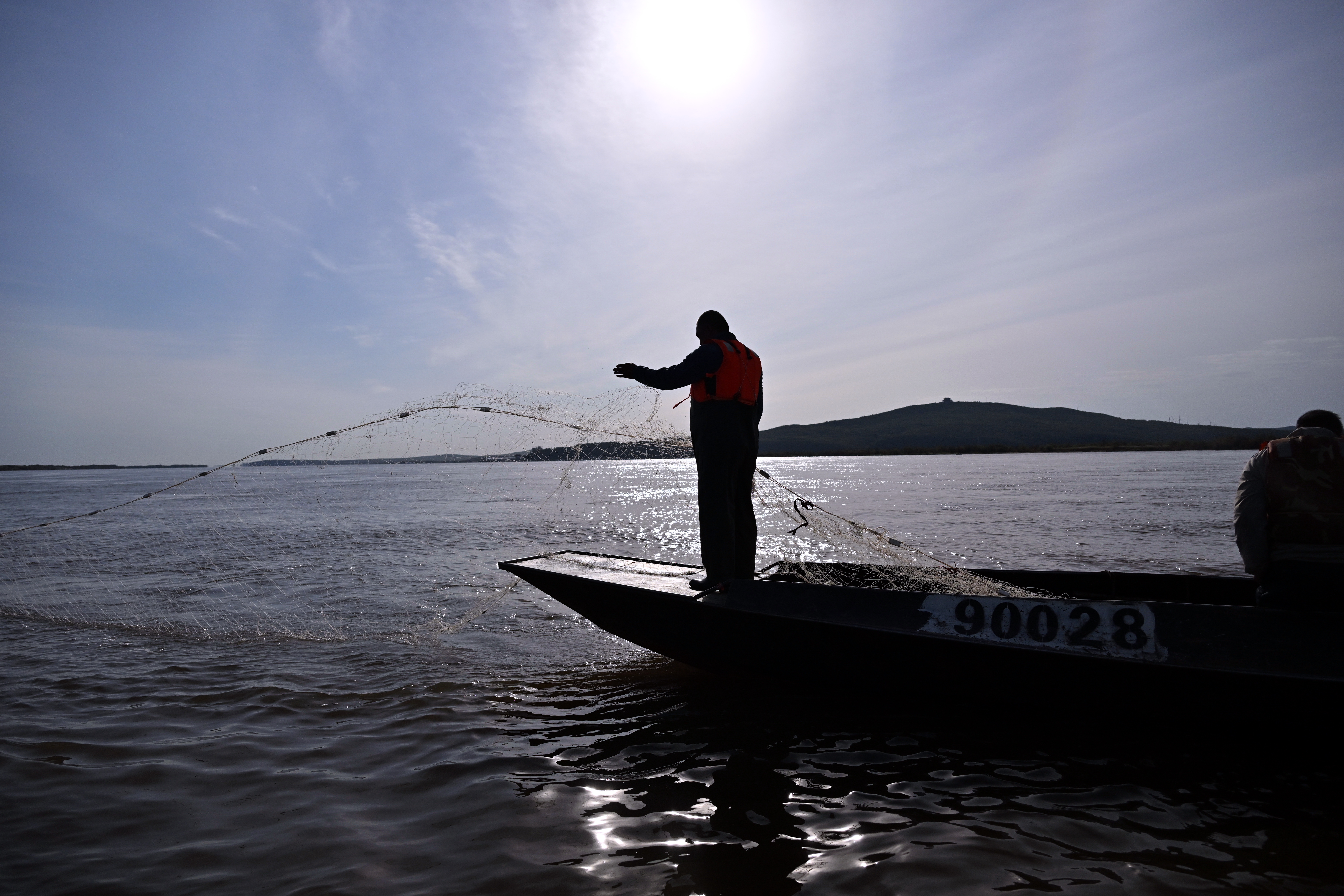 清晨,撫遠(yuǎn)國營漁場黑龍江隊(duì)隊(duì)長馬吉彬在江里捕魚