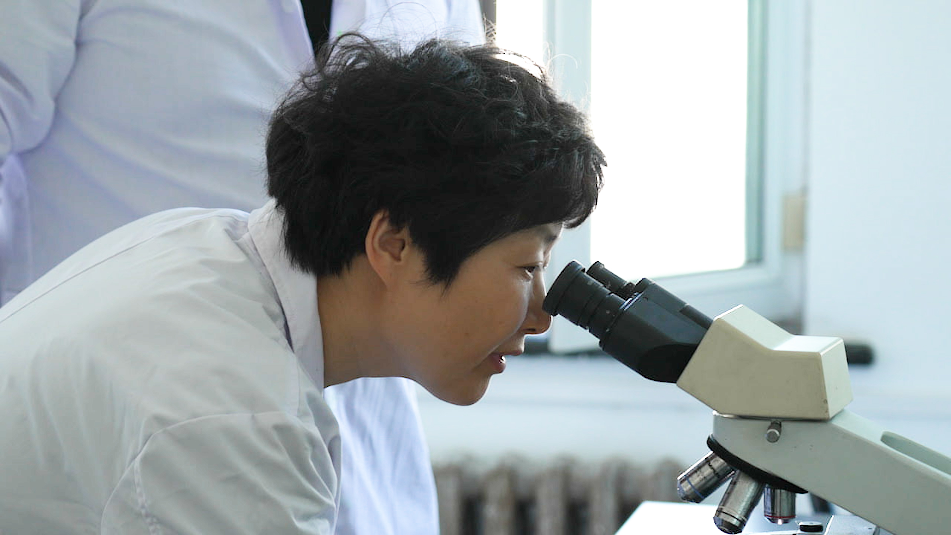 張穎通過顯微鏡為鱘鰉魚進(jìn)行疾病檢測