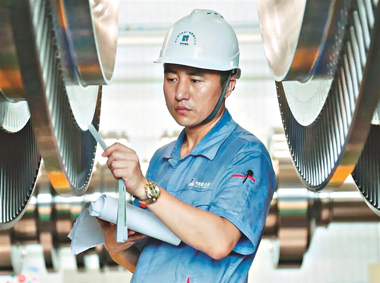 哈電汽輪機(jī)質(zhì)量控制部大件檢驗(yàn)組總裝檢查員王立安檢驗(yàn)汽輪機(jī)轉(zhuǎn)子,確保產(chǎn)品質(zhì)量。
