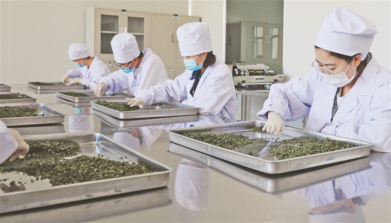 工作人員對(duì)烘干完的刺五加茶進(jìn)行分揀。