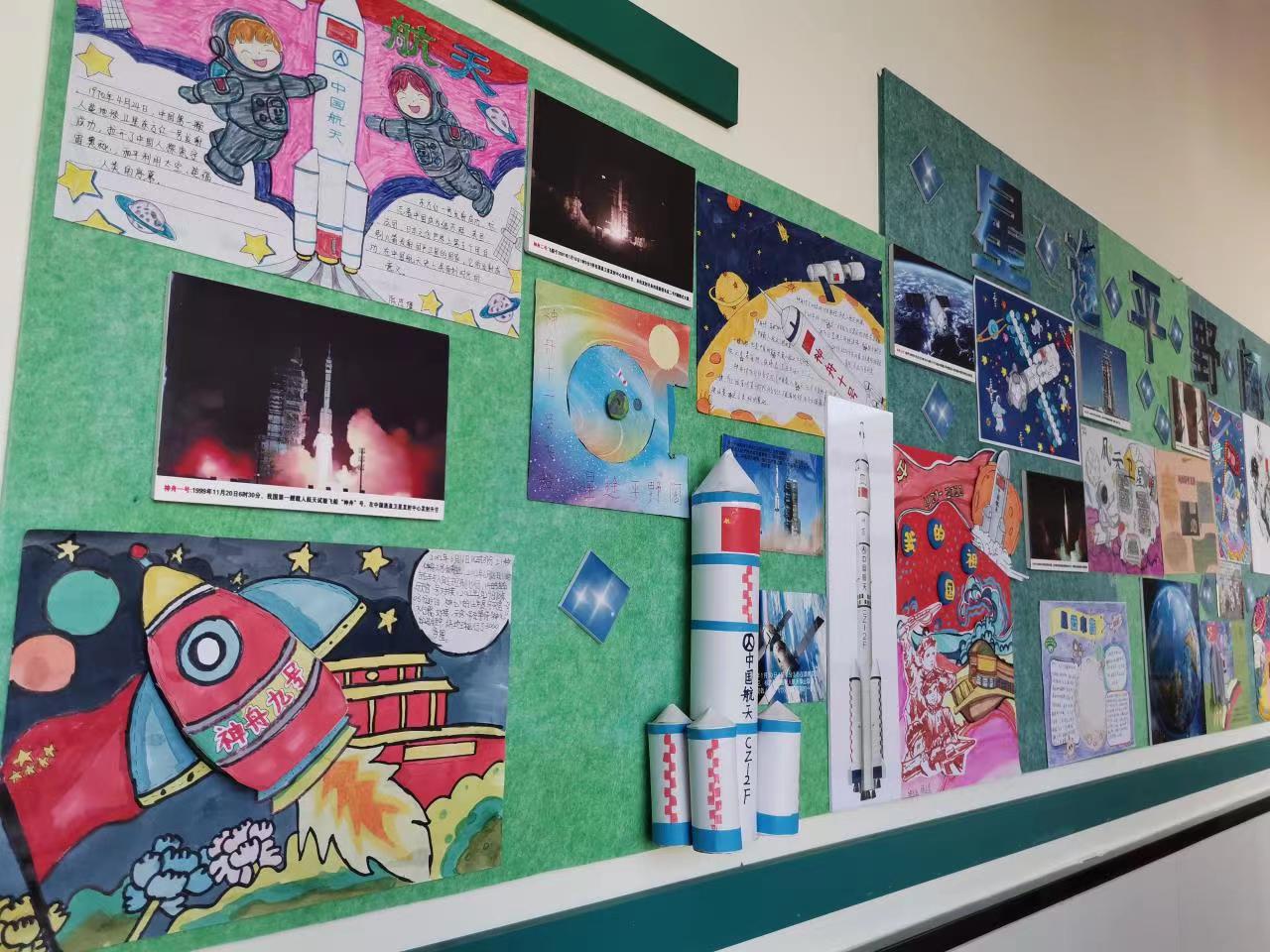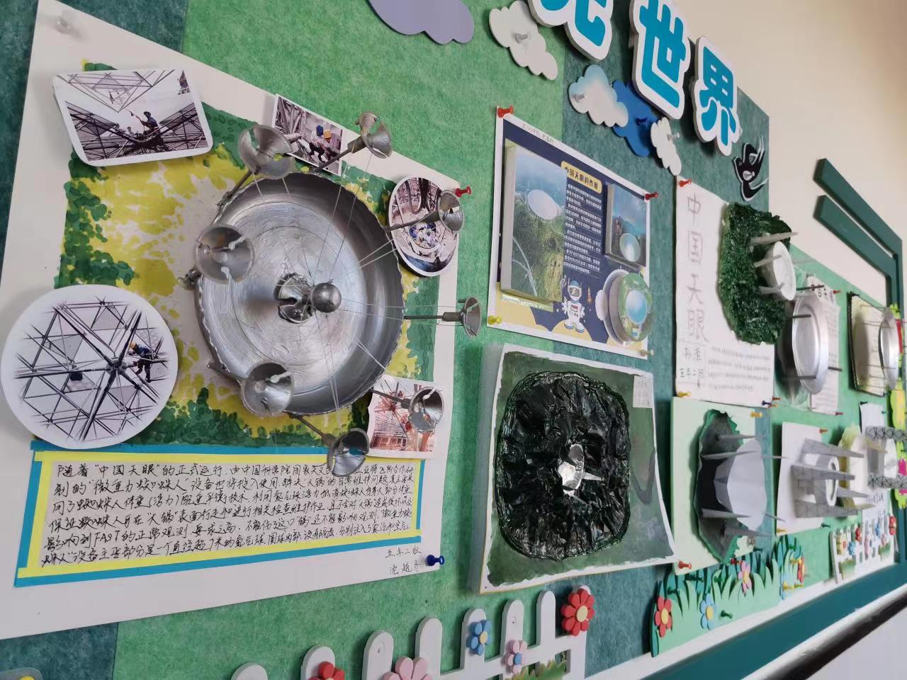 校園內(nèi),一條名為“智造未來”的中國前沿科技成果文化長廊縱貫東西,展示的是學(xué)生們用不同材料制作出中國火箭模型、天眼射電望遠鏡模型、組裝航母船模等作品,展現(xiàn)了學(xué)生對科學(xué)探索的動手實踐能力和對科學(xué)家的無限崇敬與熱愛之情,激發(fā)了學(xué)生學(xué)科學(xué)、用科學(xué)的濃厚興趣。