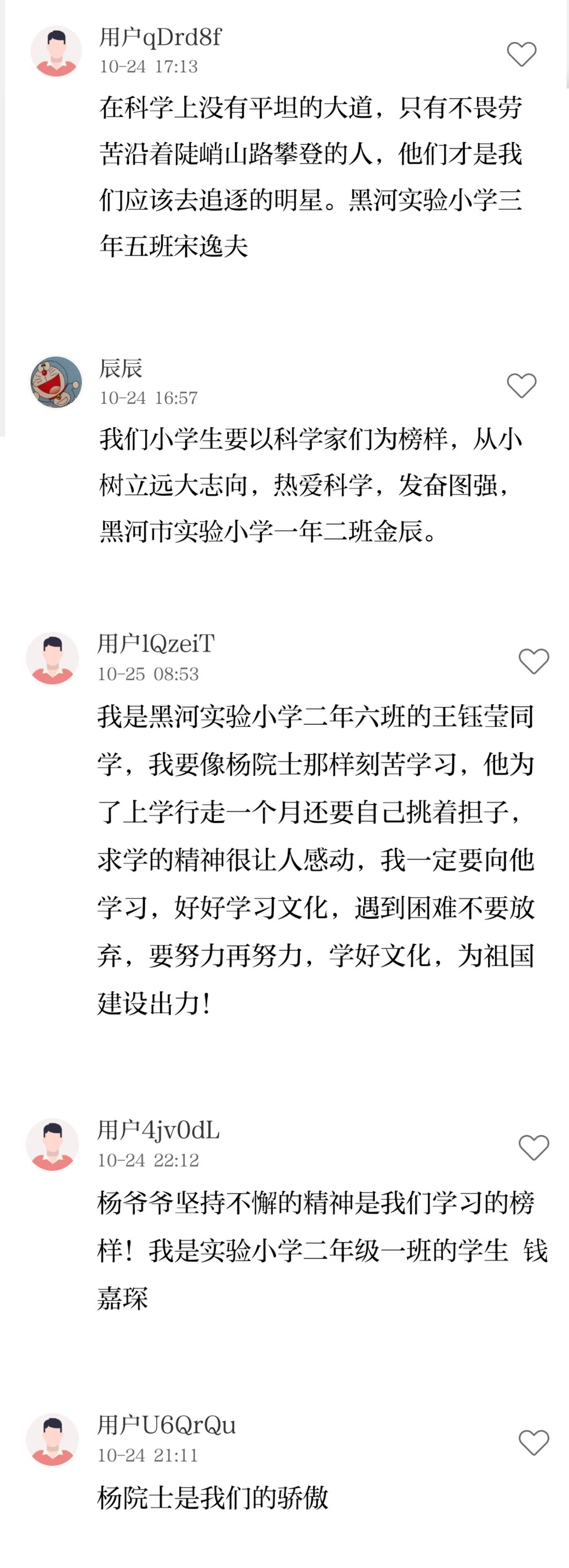 黑河市實驗小學(xué)組織學(xué)習(xí)楊士莪院士、楊德森院士的故事,學(xué)生們被他們“心有大我,至誠報國”的感人事跡和愛國情懷深深震撼。學(xué)生們紛紛在龍頭新聞客戶端留言,向他們心懷國家,不畏艱難、砥礪前行,用科技的力量為祖國三百萬平方公里的藍色海疆保駕護航的愛國之情致敬。