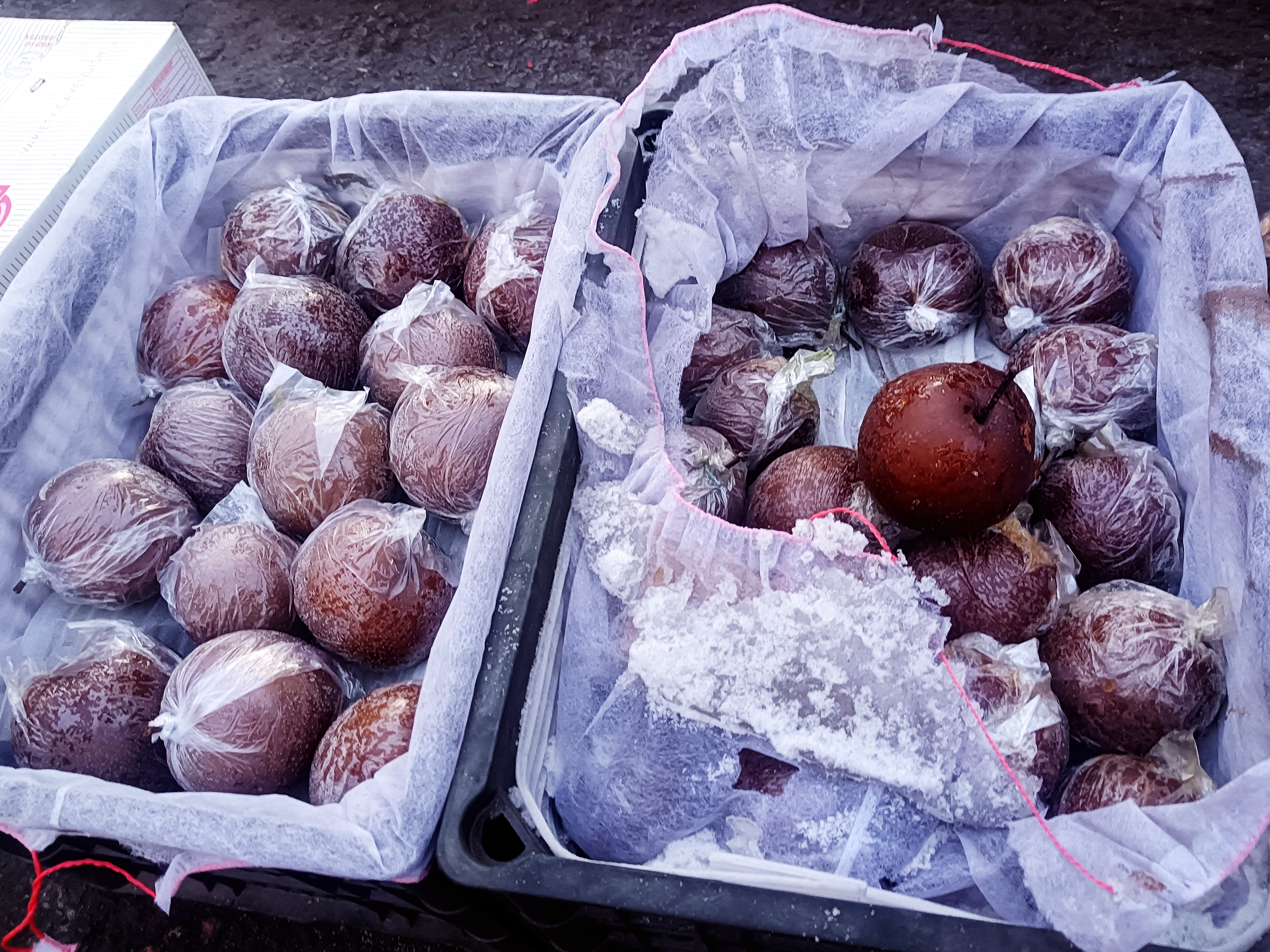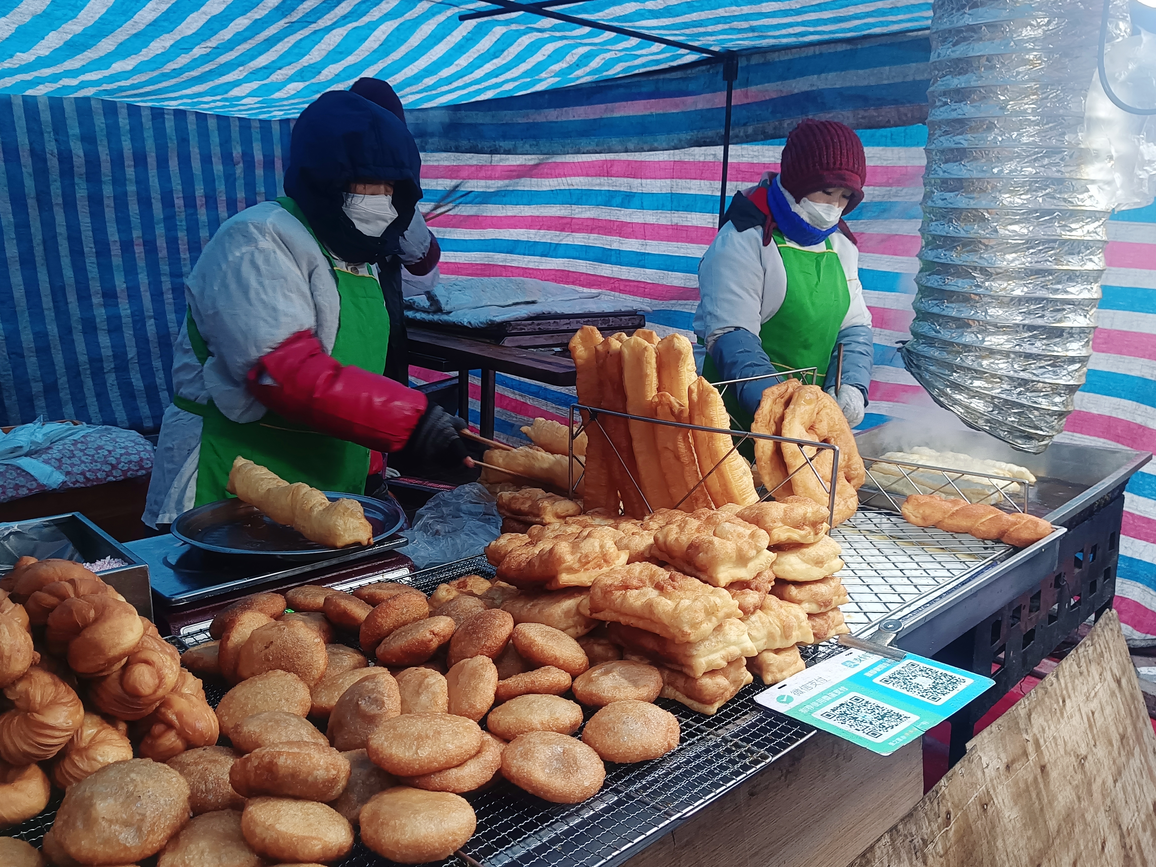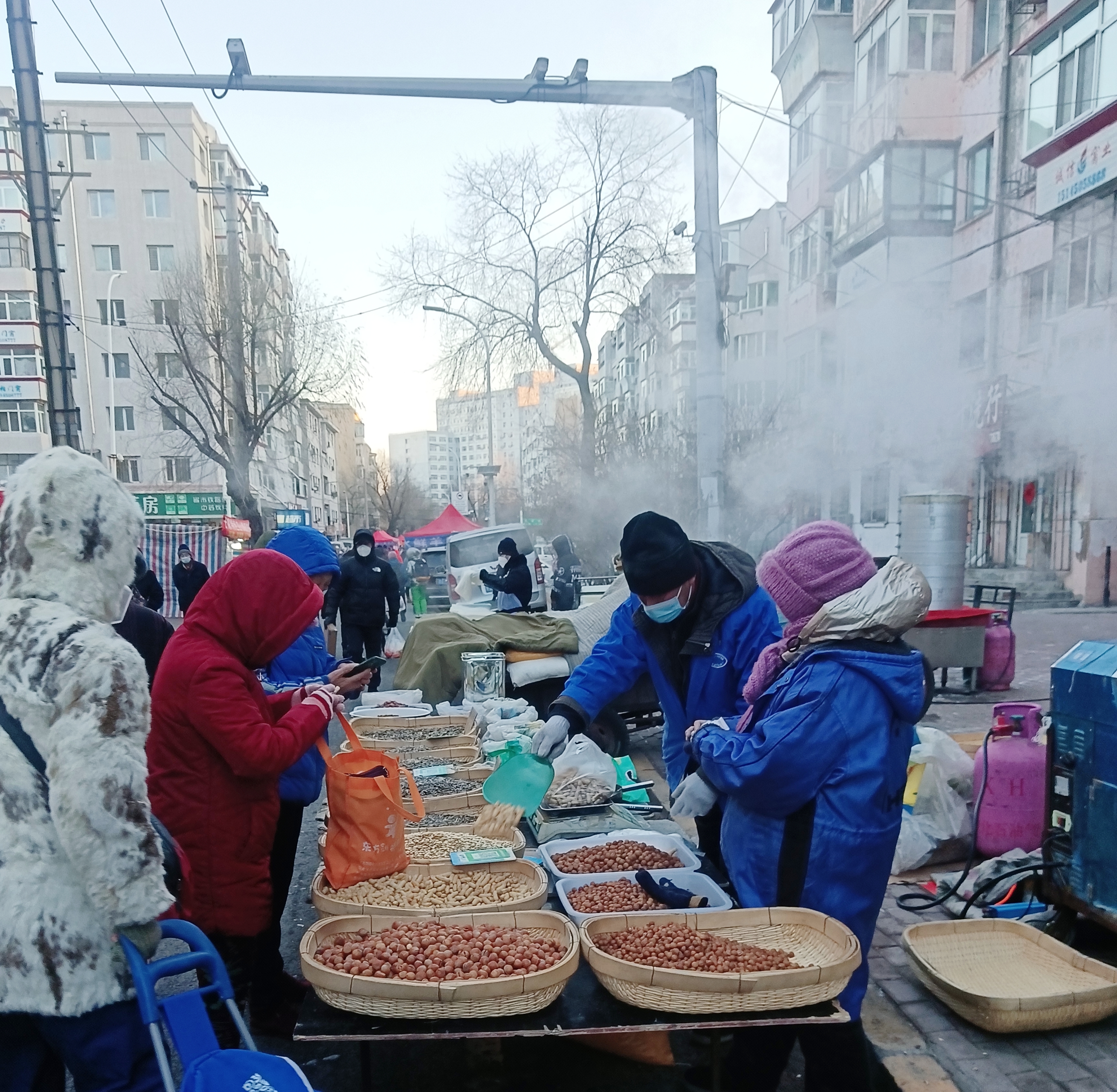 在肉類攤區(qū),攤主將一口大鍋架到門口,鍋里煮著大腸和豬蹄,旁邊的大盆里還裝著不少提前加工好的血腸,熱氣騰騰、香味四溢。肉攤旁邊的凍貨區(qū)也是熱鬧非凡,整齊排列的各種凍魚(yú)、黃澄澄的凍柿子、帶著冰碴的凍梨都成了早市上的“香餑餑”。