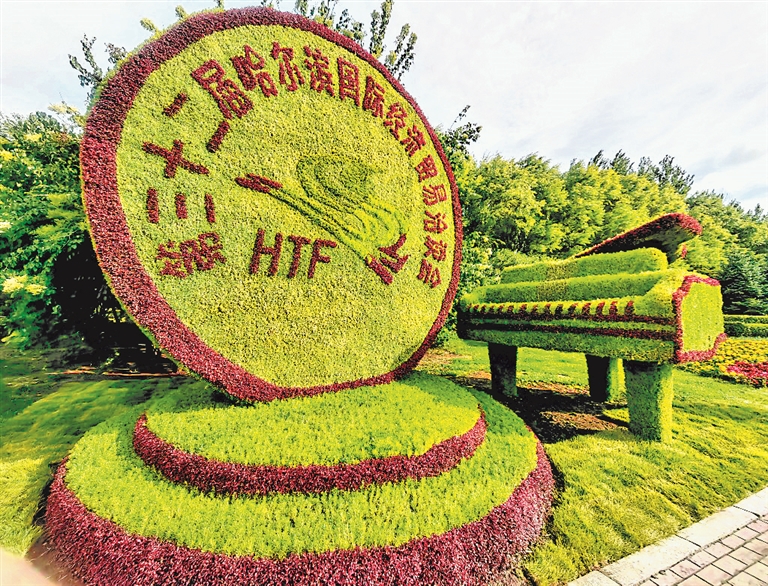 哈爾濱市機(jī)場(chǎng)高速旁的哈洽會(huì)主題綠色景觀。
