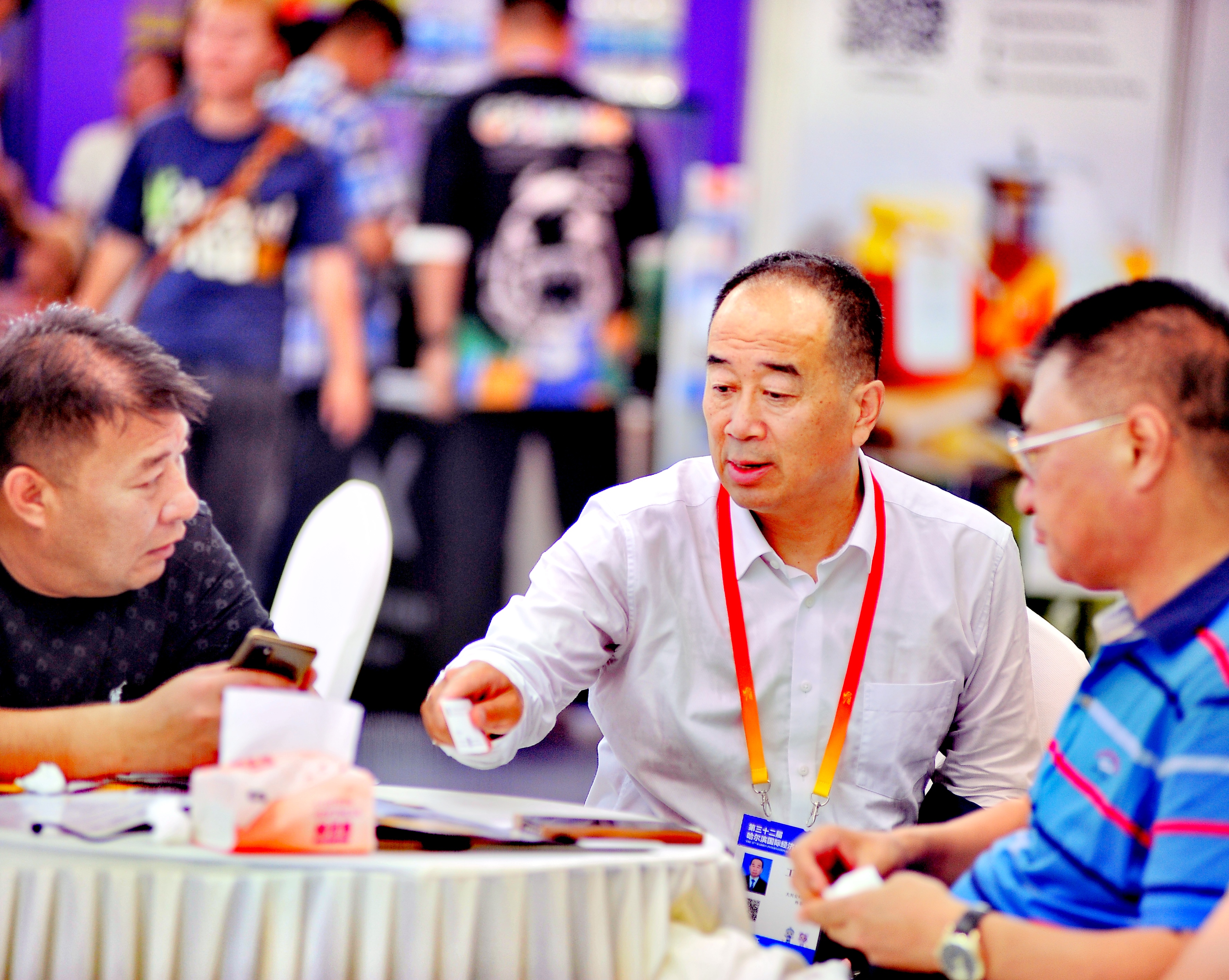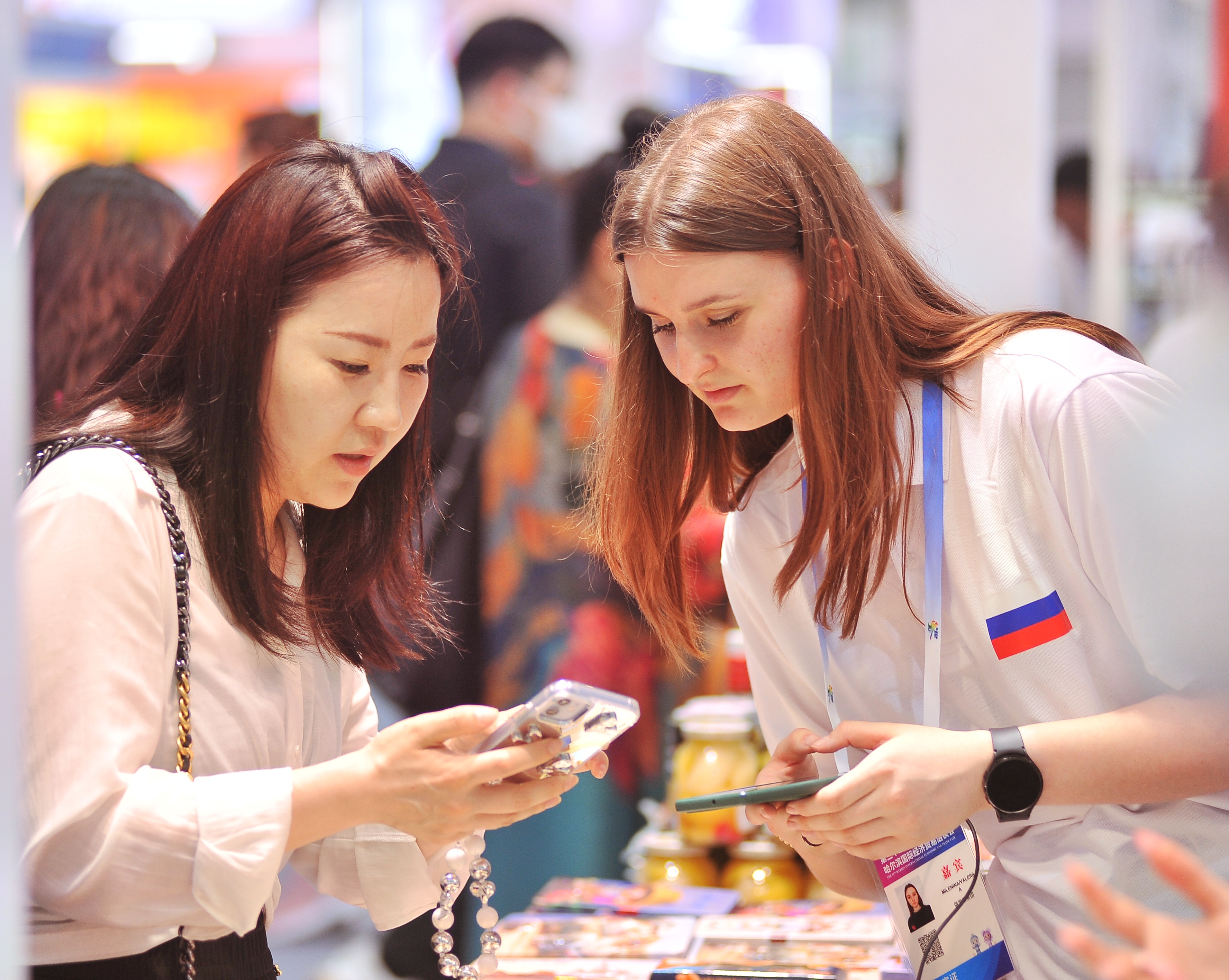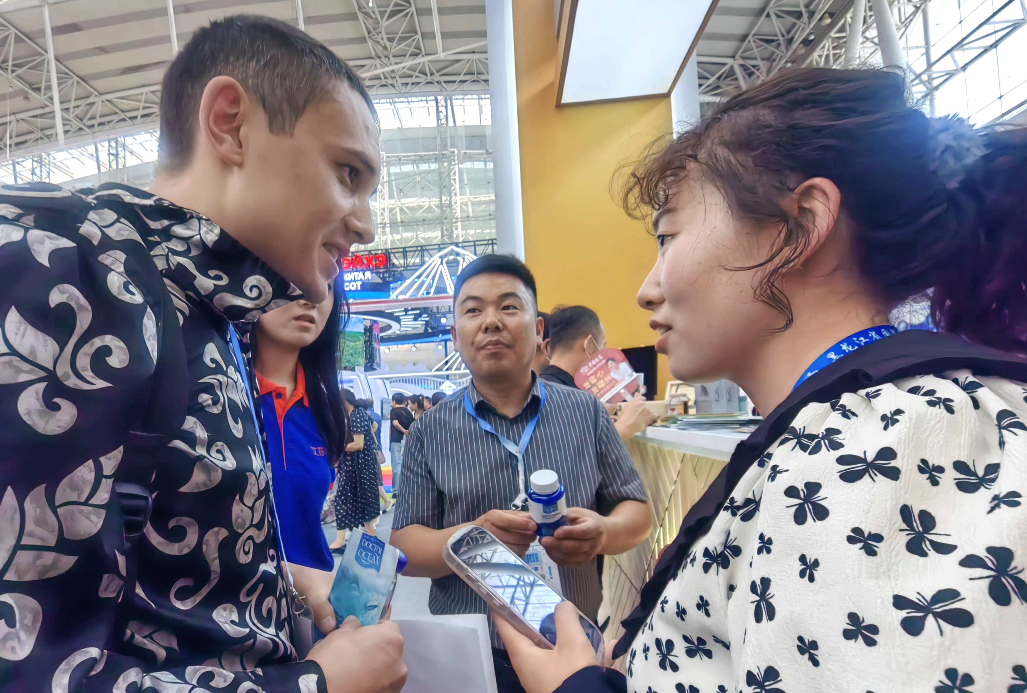 第三十二屆哈洽會上,中外客商們一邊忙著參觀,一邊忙著洽談。