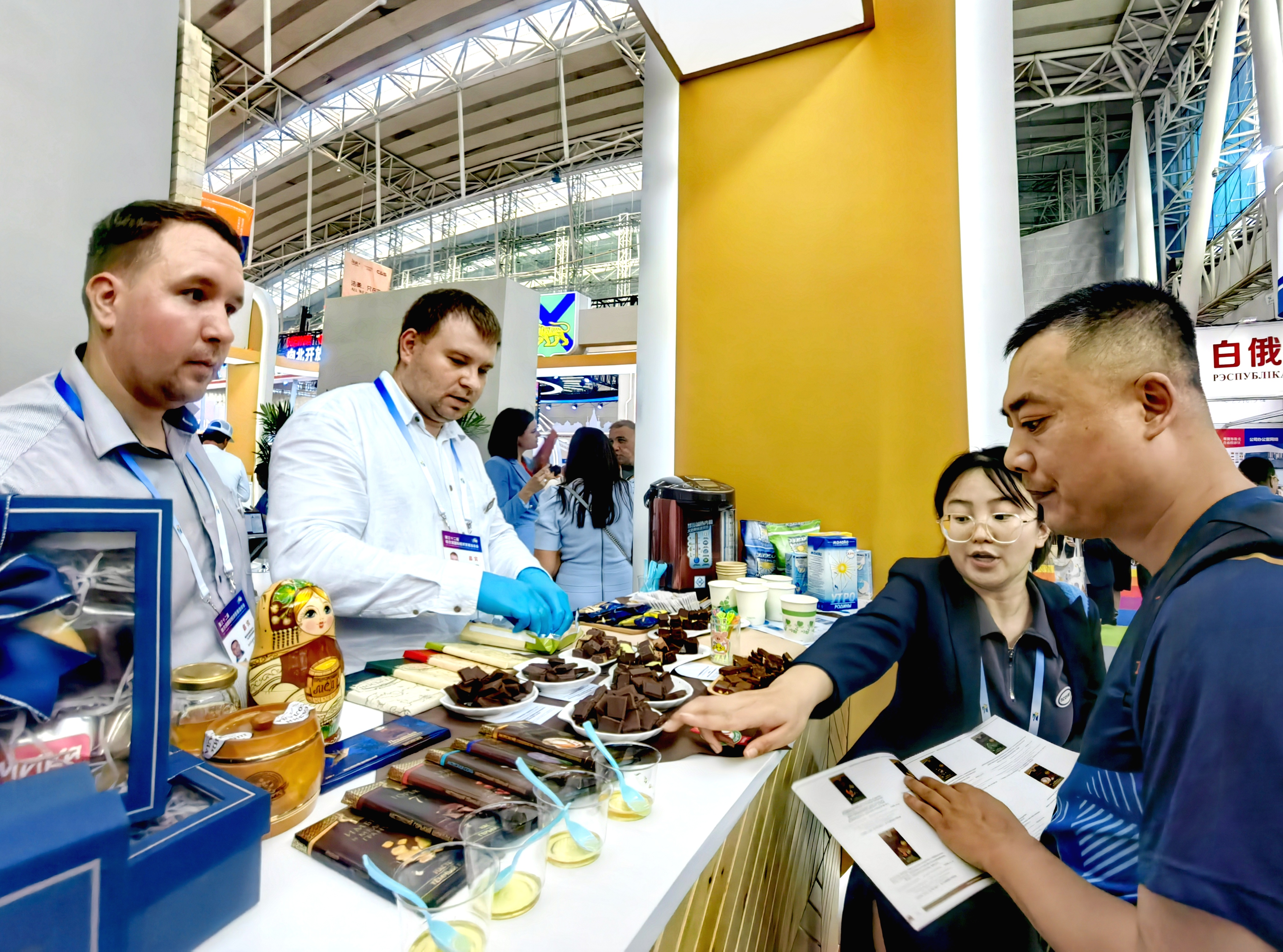 在一處外國展位,一位中國客商對展臺上的蜂蜜、巧克力和糕點(diǎn)等食品產(chǎn)生興趣,他一邊品嘗著,一邊稱贊味道好,并表達(dá)出要與對方進(jìn)行深度合作的意向。