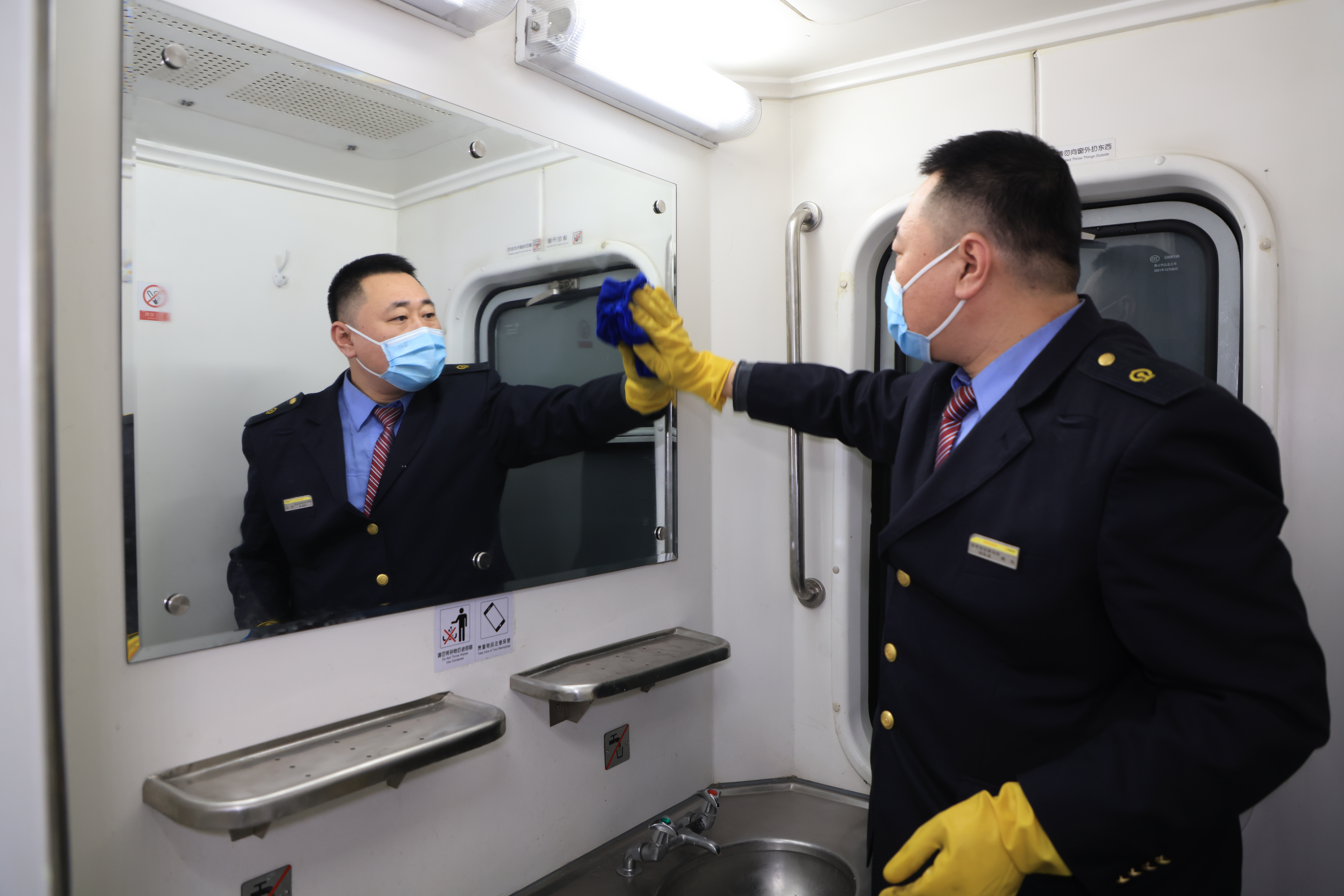 列車員清理洗臉室衛(wèi)生