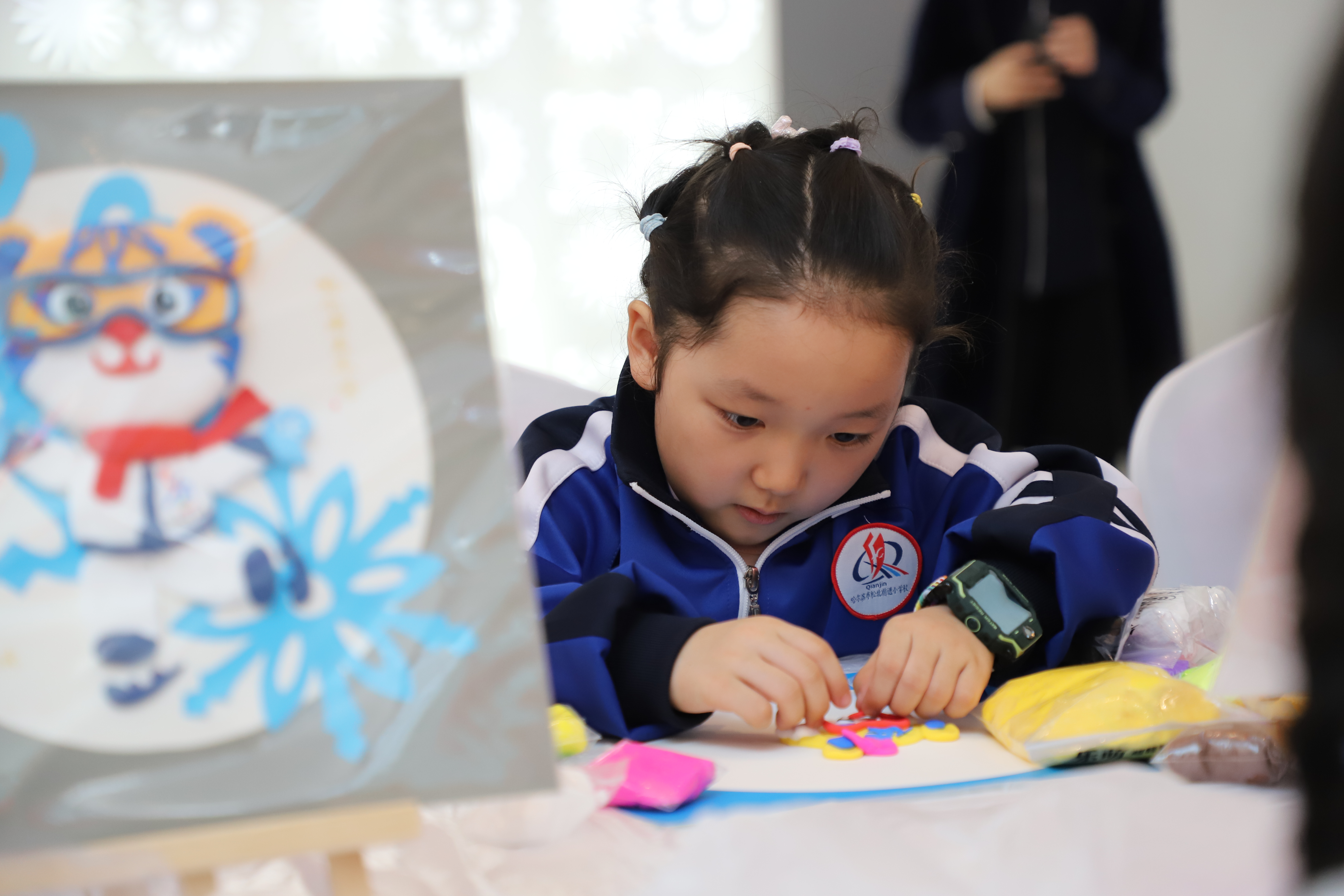 “阿姨,你看我的這個(gè)滑雪剪紙好看嗎?你看這個(gè)亞冬會(huì)吉祥物‘濱濱’‘妮妮’捏得像不像?”在文化作品創(chuàng)作展示活動(dòng)區(qū),孩子們熱情地展示著自己創(chuàng)作的剪紙和泥人非遺作品。