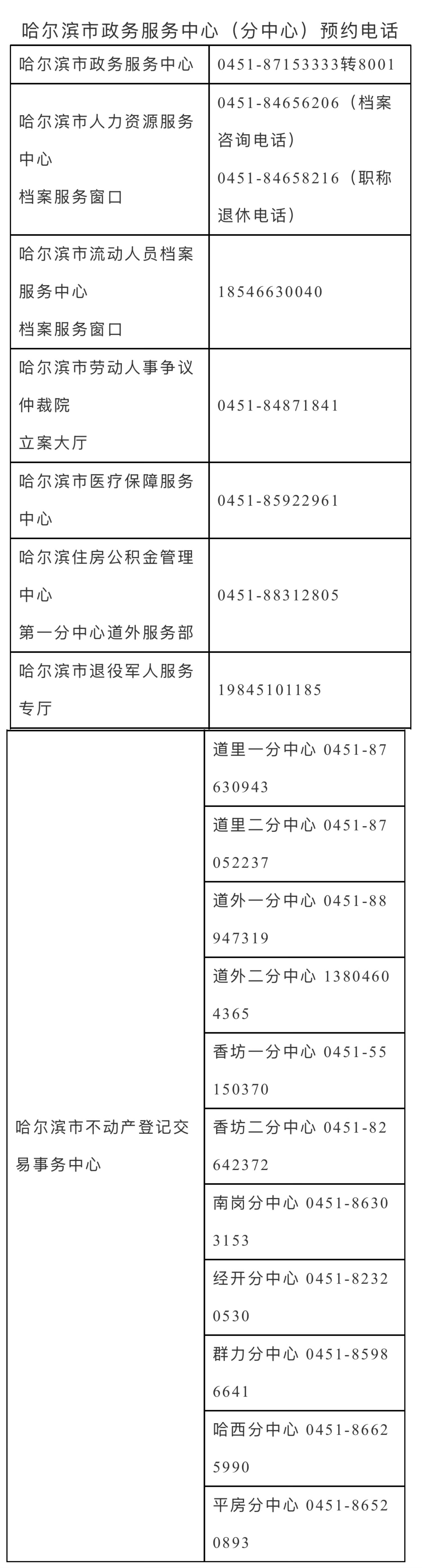 哈爾濱市政務(wù)服務(wù)中心(分中心)預(yù)約電話(huà)表
