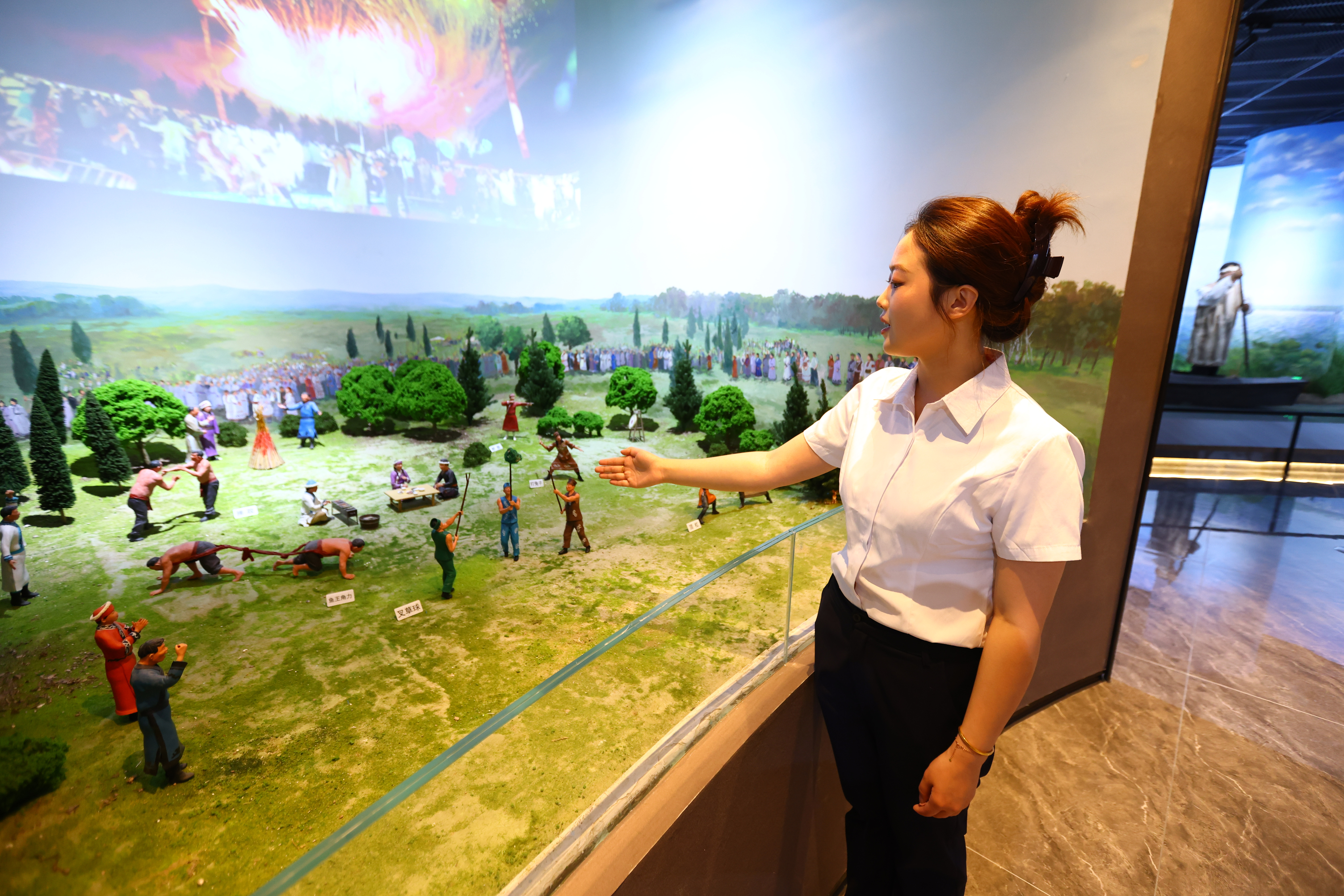 講解員闡述赫哲族的傳統(tǒng)運(yùn)動(dòng)