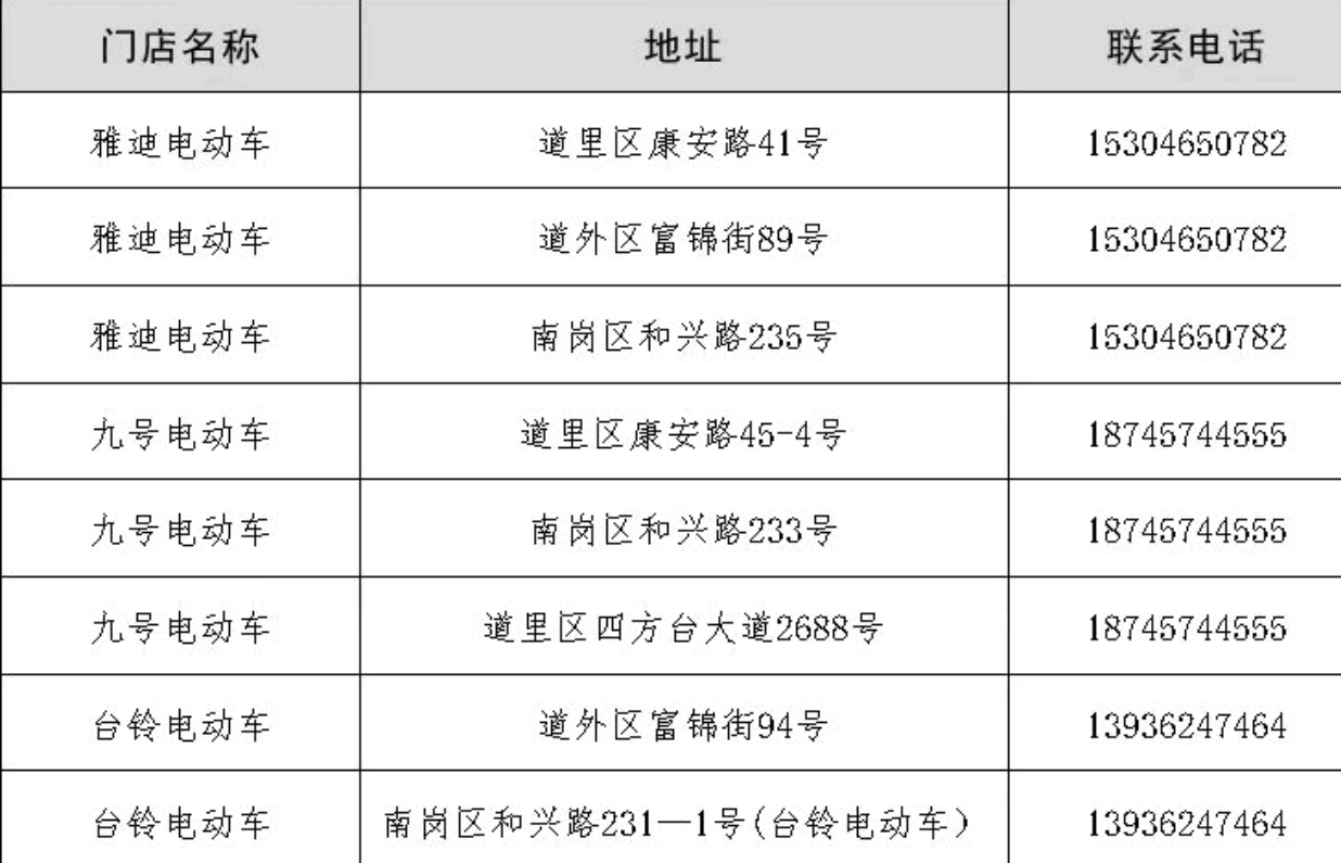 經(jīng)自愿報名,日前,哈市電動車流通行業(yè)協(xié)會在全市遴選了第一批8家電動自行車經(jīng)銷單位,在道里區(qū)、南崗區(qū)、道外區(qū)電動自行車銷售集散地設(shè)置服務(wù)站點,為雅迪、九號、臺鈴品牌電動自行車開展免費“體檢”。電動自行車用戶可根據(jù)持有車輛品牌,分別前往各自品牌服務(wù)站點參與活動。此次活動截至2025年1月19日,服務(wù)內(nèi)容包括: