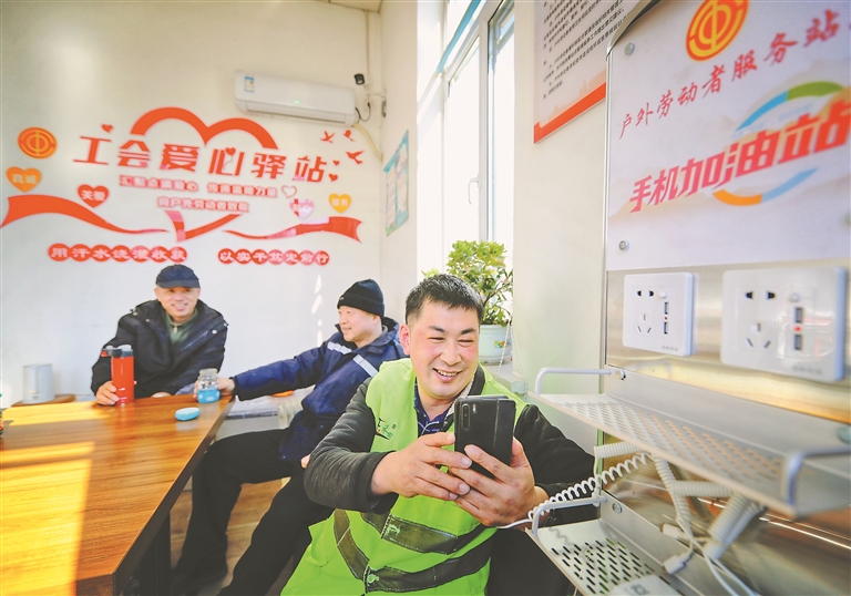 環(huán)衛(wèi)工人和公交車司機在服務站充電、休息。